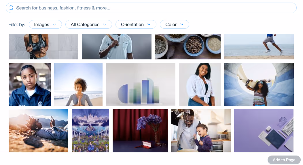 O Wix oferece milhares de fotos gratuitamente e também tem uma biblioteca da Shutterstock na qual você pode comprar imagens.