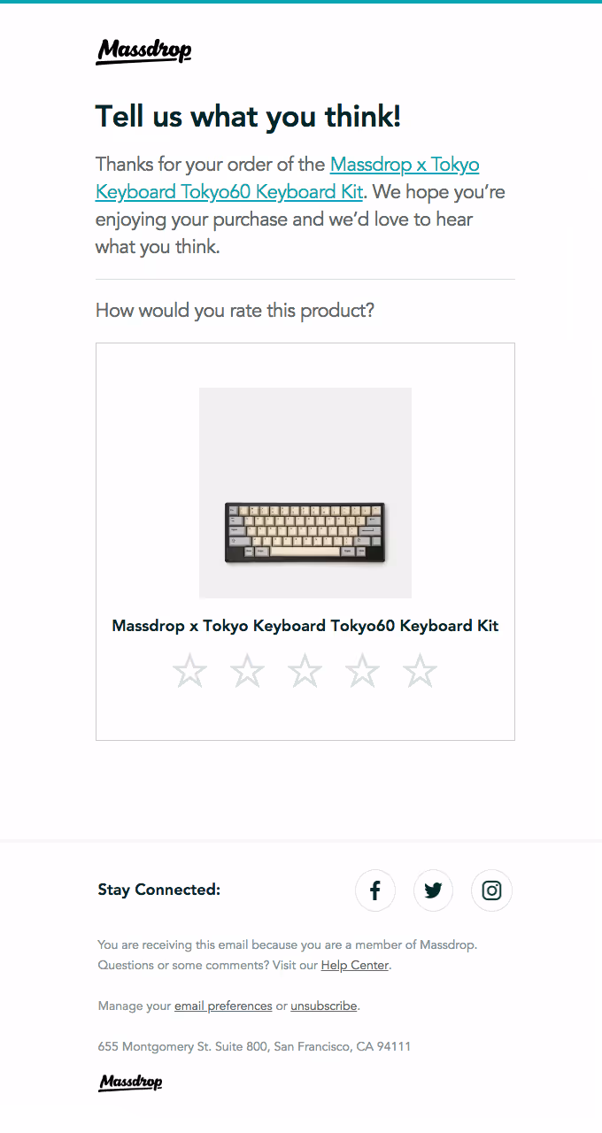 Denken Sie daran: Achte darauf, dass der Kunde genug Zeit hat, das Produkt auch tatsächlich zu verwenden, und du entscheidest, was es davon hält. Es wäre ratsam, die E-Mail ein oder zwei Tage nach der Lieferung zu senden.