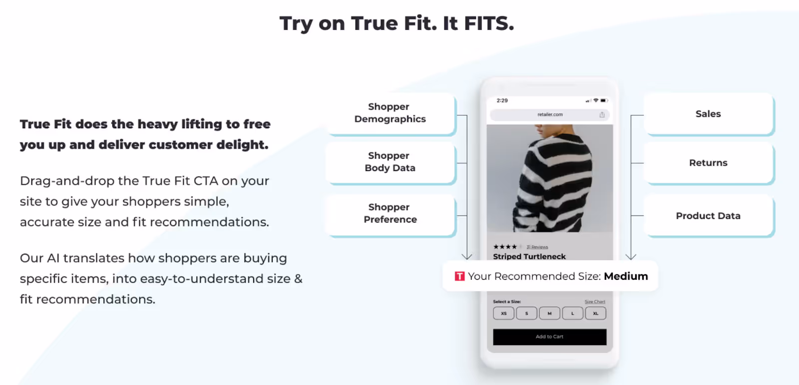 1. Echte Passform - Steigert den Umsatz mit KI-gesteuerten Größenvorschlägen, die auf die Präferenzen der Käufer zugeschnitten sind.