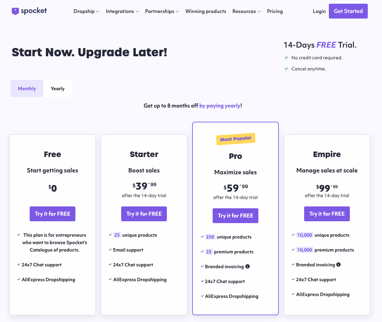 Beim Vergleich von Spocket mit Oberlo haben beide unterschiedliche Preisstufen. Spocket hat vier Preisstufen, die maximale Flexibilität bei der Skalierung Ihres Unternehmens ermöglichen. Neue Dropshipper, die sich das auf Spocket verfügbare Produktinventar ansehen möchten, können sogar auf ein kostenloses Konto zugreifen.
