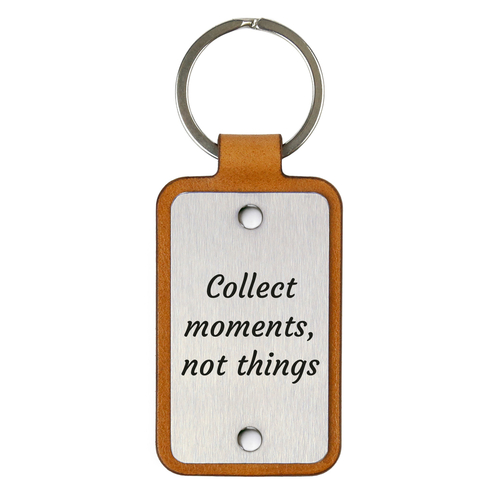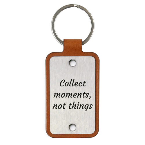 Handcrafted leather keychain with a stainless steel plate, engraved with the picture – Collect moments, not things.