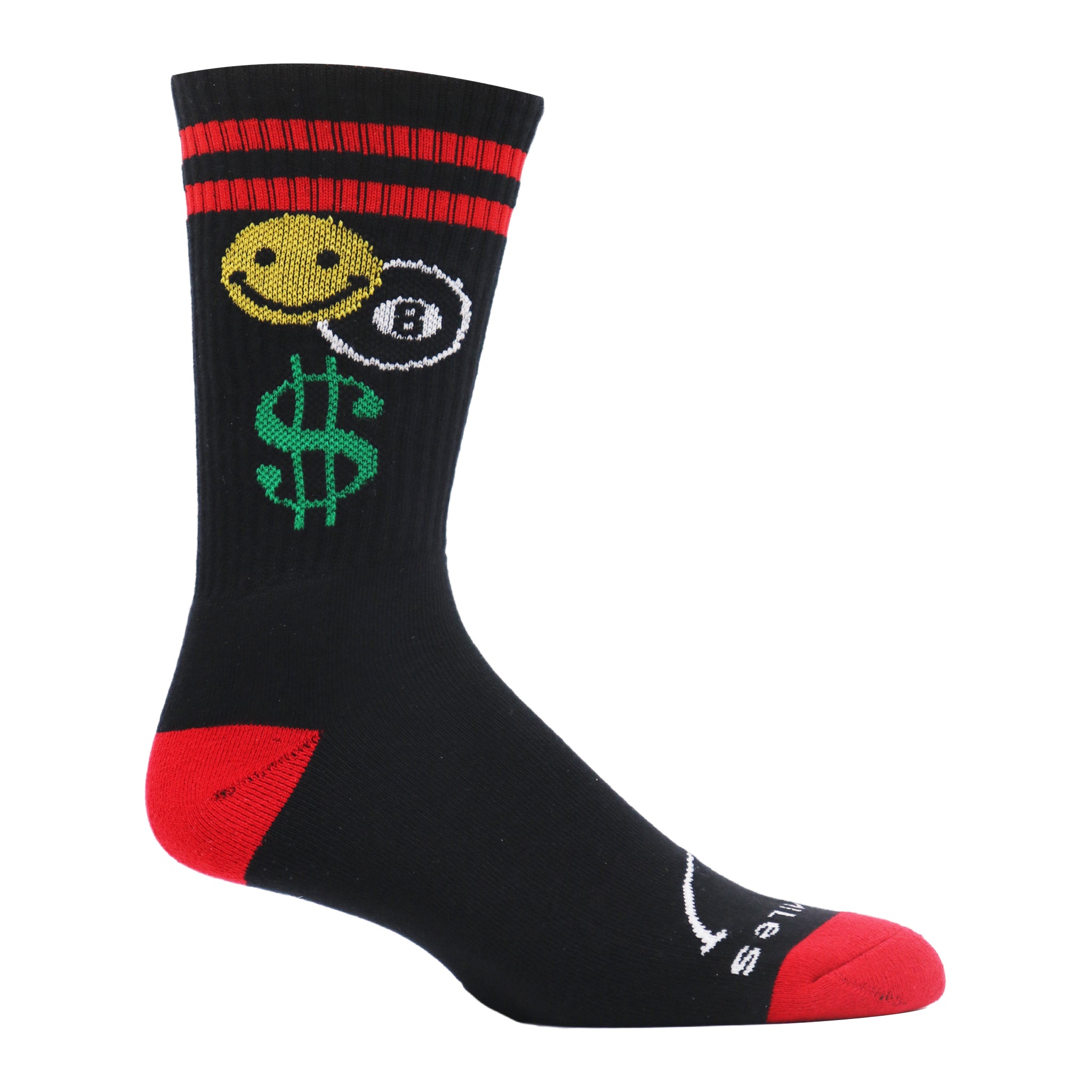 Introducing the All Smiles Crew Socks, the perfect blend of comfort and style for those who love to express themselves through fashion. These socks are not just a piece of clothing; they are a statement. With a variety of fun emojis, including a gaming character, a middle finger, a marijuana pot leaf, a smiley face, an eight ball, and a dollar money sign, these socks are designed to bring a smile to your face and a touch of edginess to your outfit.