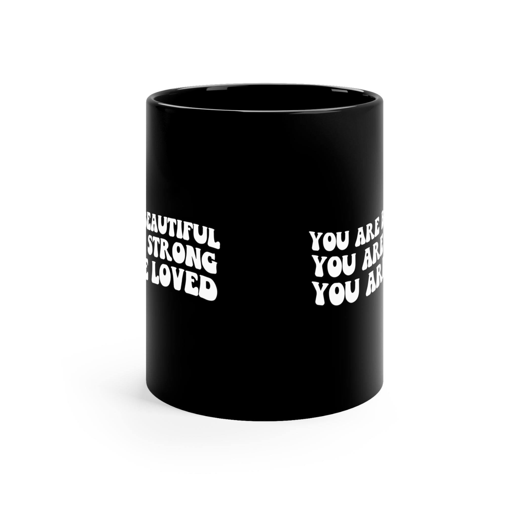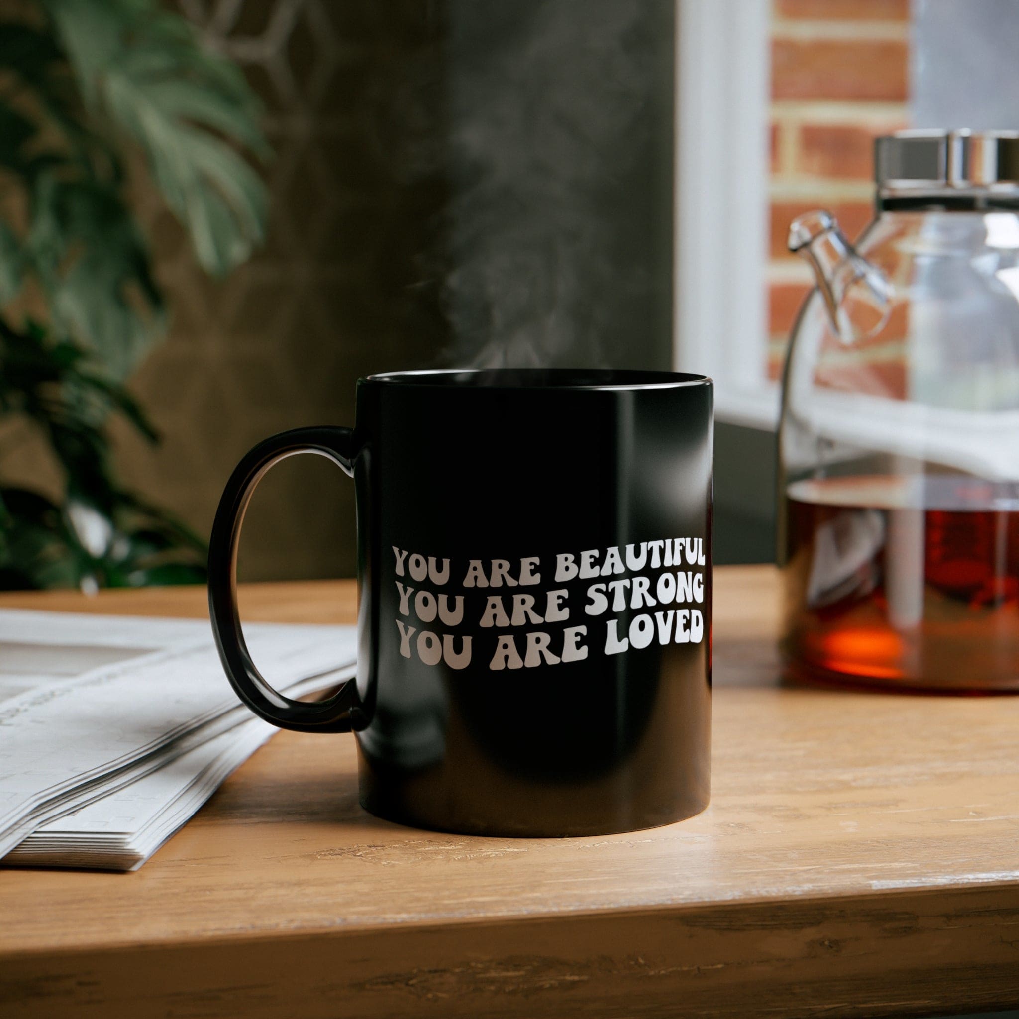 The Black Ceramic Mug makes for a thoughtful gift for friends, family, or colleagues. Its inspirational message, 'You are Beautiful Strong Loved,' adds a personal touch that can uplift anyone's spirits. Whether it's for a birthday, holiday, or just because, this mug is a versatile gift that is sure to be appreciated. Its contemporary design makes it suitable for any occasion, and it can be paired with gourmet coffee or tea for an extra special touch.