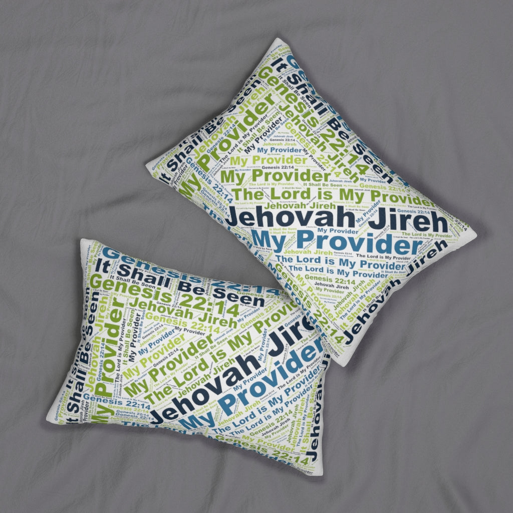 Transform your living space with the Decorative Lumbar Throw Pillow featuring the inspiring phrase 'Jehovah Jireh my Provider.' This beautifully designed pillow not only adds a touch of elegance to your home decor but also serves as a daily reminder of faith and provision. Made from high-quality spun-polyester fabric, this pillow is both stylish and functional, making it a perfect addition to any room.