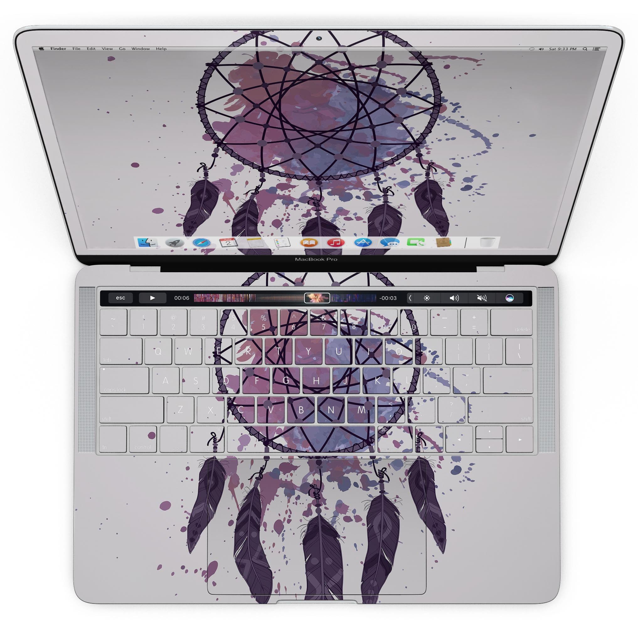 The Dreamcatcher Splatter Skin Kit is designed specifically for the new 13" and 15" MacBook Pro models with Touch Bar. When ordering, you can easily select the size that fits your device perfectly from the dropdown menu. This precision-cut design ensures that every corner and edge of your MacBook is covered, providing a seamless look that enhances its overall appearance.