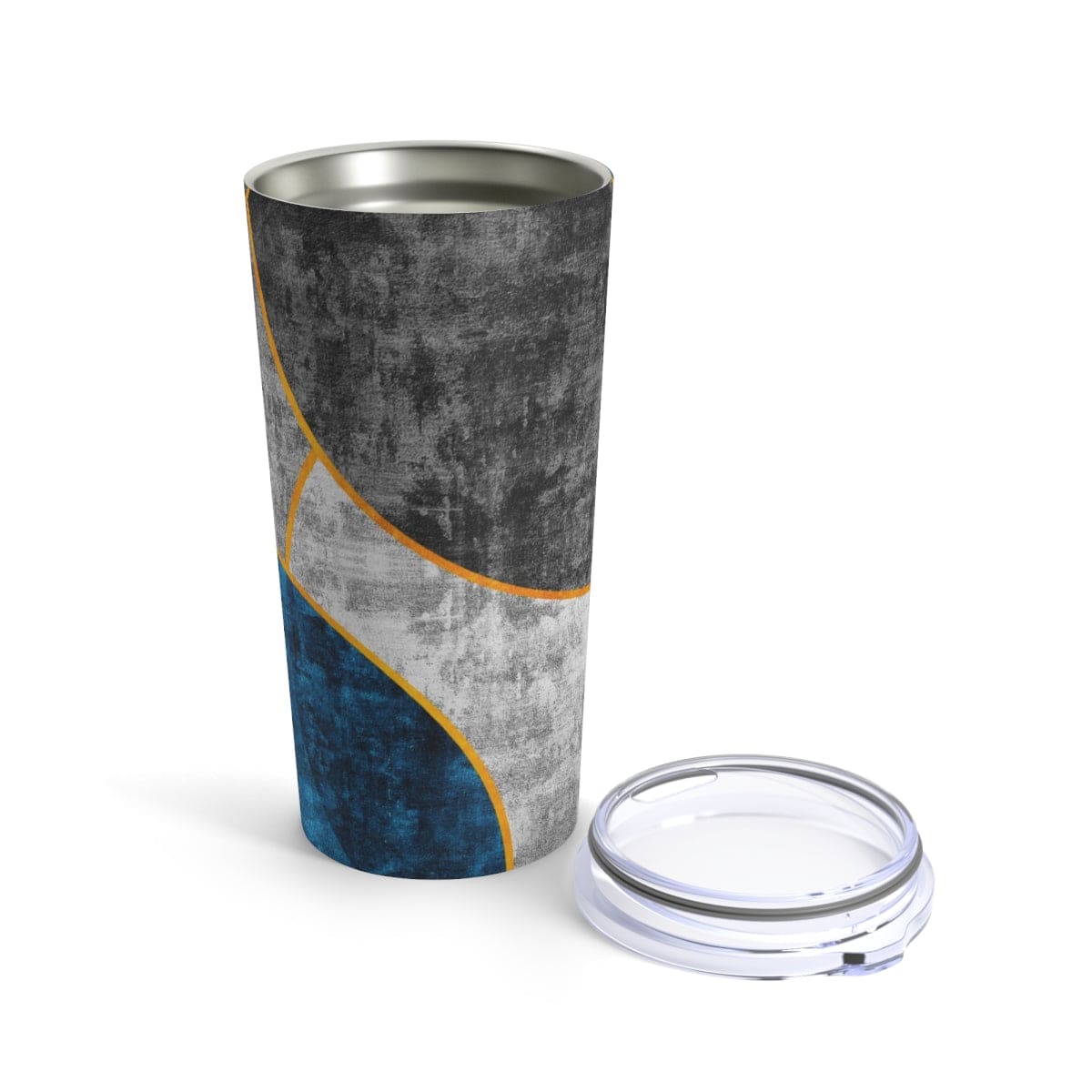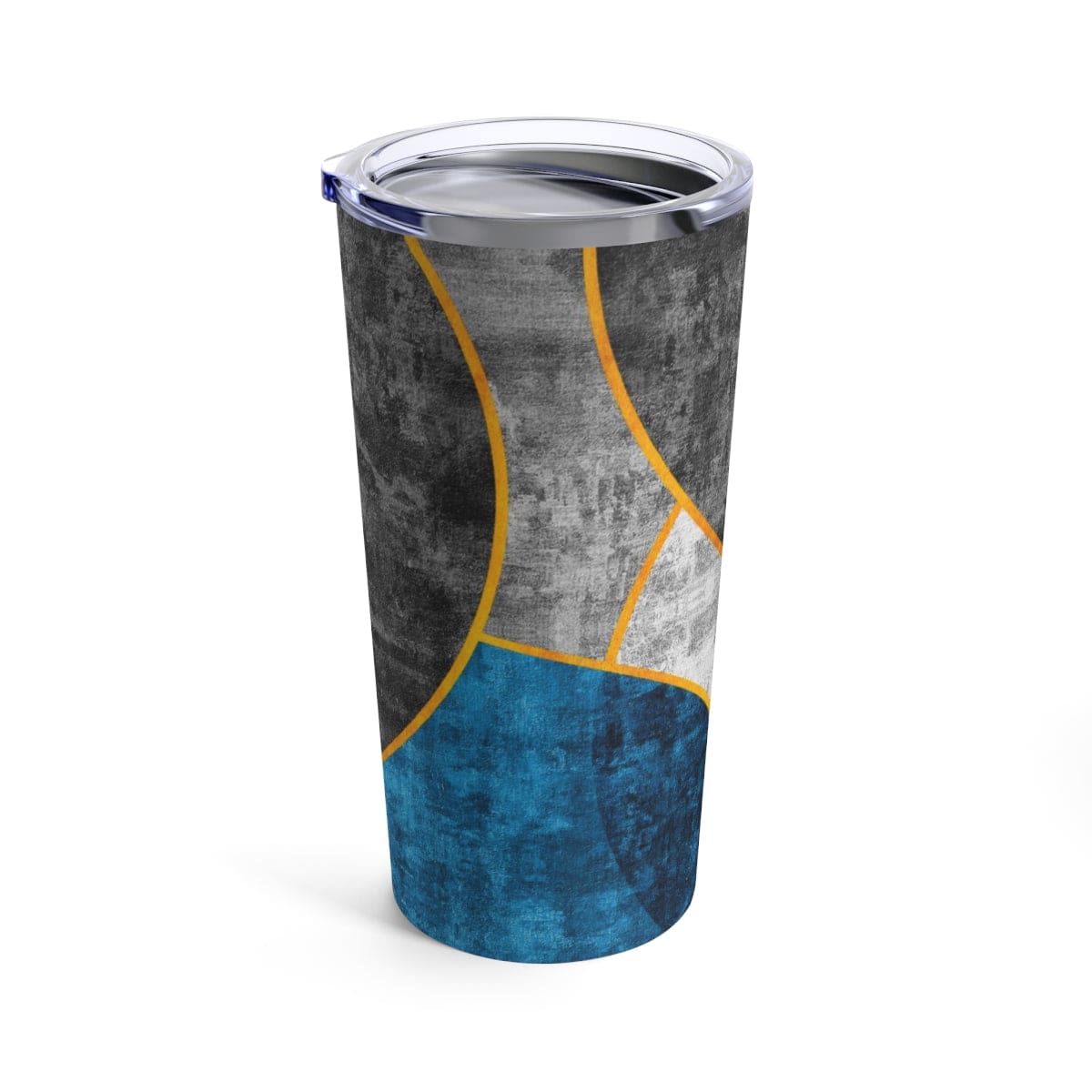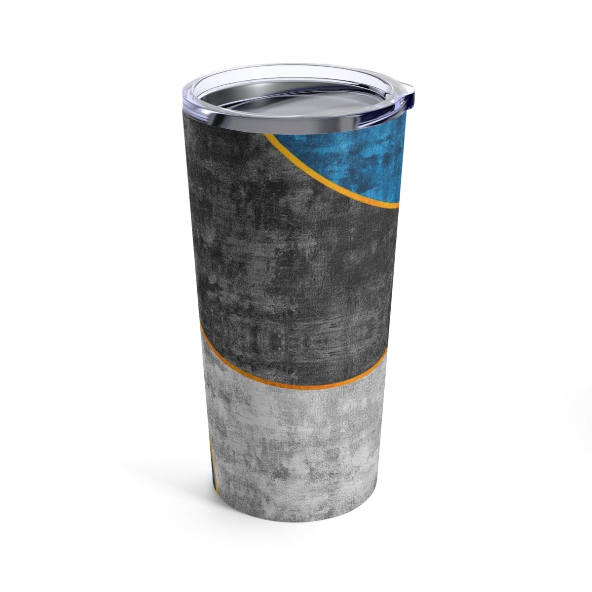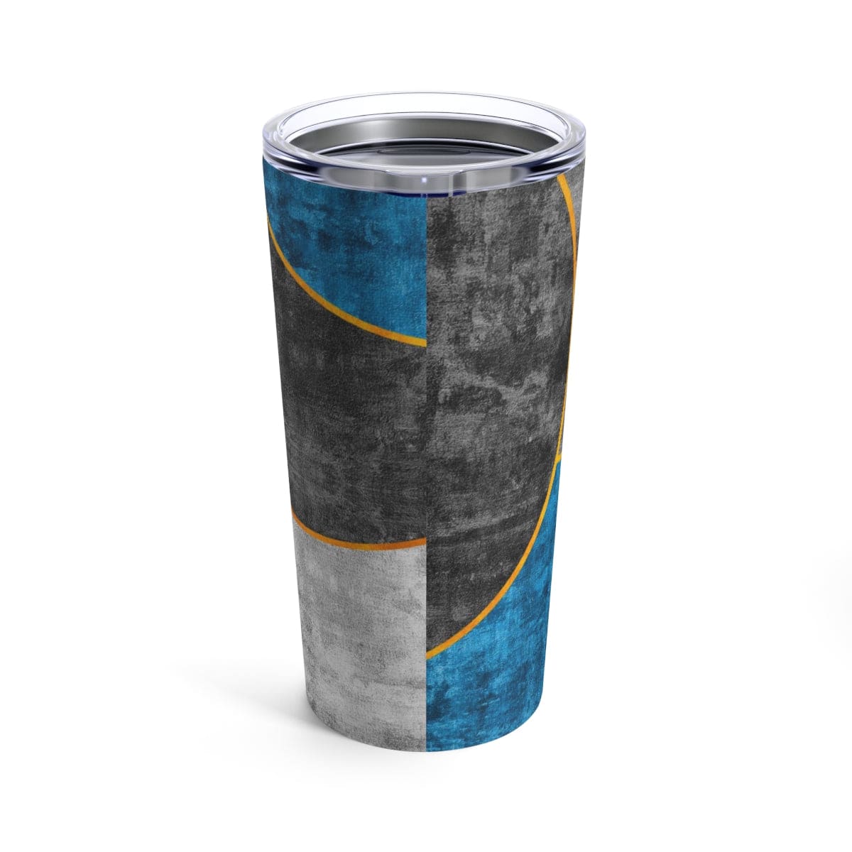 Introducing the Insulated Tumbler 20oz, a perfect blend of style and functionality. This travel-size tumbler is designed to keep your beverages at the ideal temperature, whether you're on the go, at the office, or enjoying a day in the countryside. With its striking black, blue, and grey circular geometric pattern, this tumbler not only serves its purpose but also makes a fashion statement.