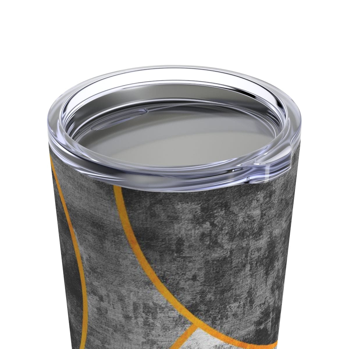 Not only is this tumbler functional, but it also boasts a stylish design that sets it apart from ordinary drinkware. The black, blue, and grey circular geometric pattern adds a modern touch, making it a great accessory for any outfit. Whether you're heading to the gym, the office, or a picnic, this tumbler will complement your style.