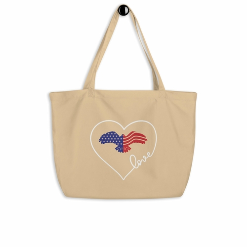 The eye-catching red, blue, and white eagle heart print adds a touch of personality to your everyday look. This inspirational design not only makes a fashion statement but also serves as a reminder to embrace your passions and soar to new heights. Whether you're using it for errands or as a statement piece, this tote bag is sure to turn heads.