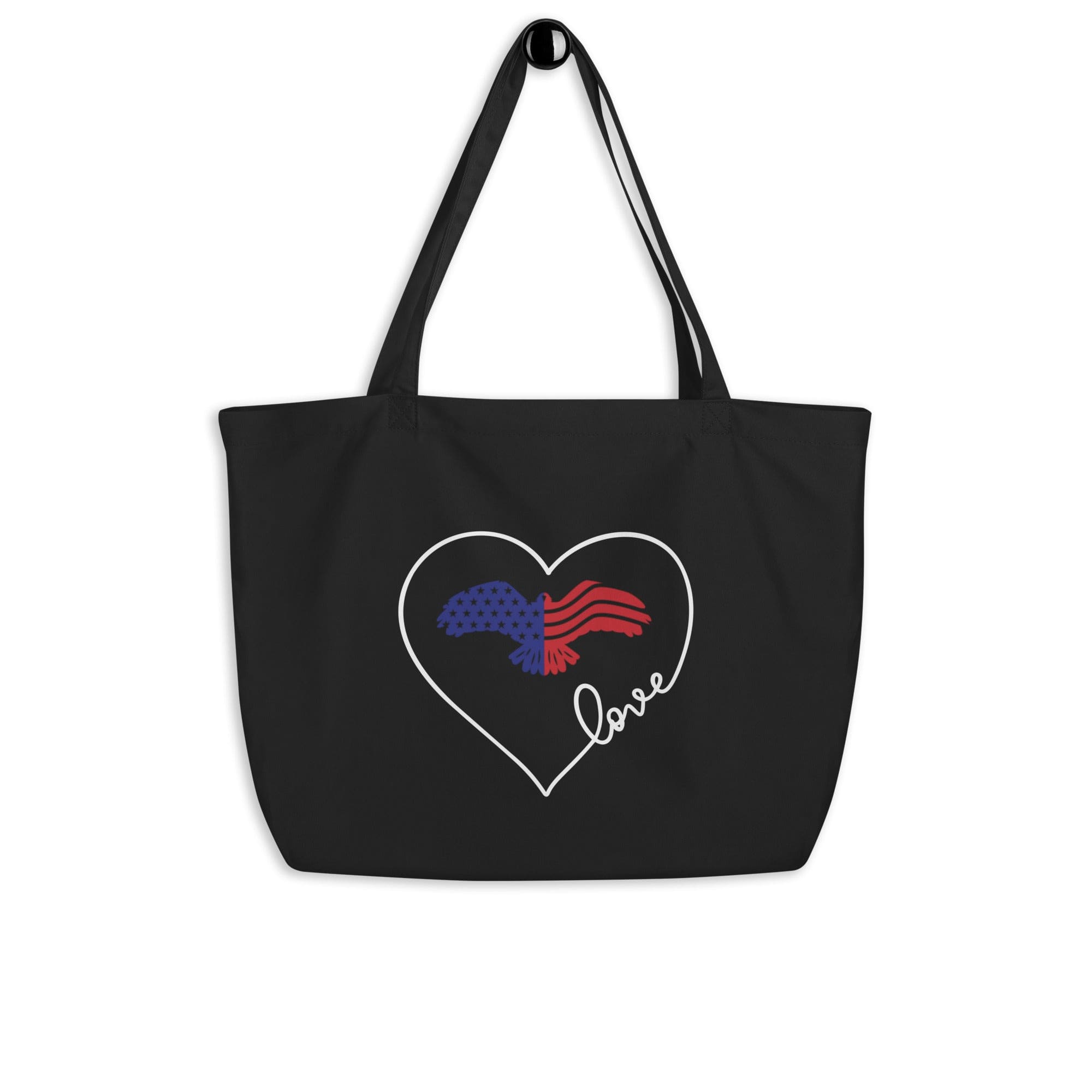 The Large Black Tote Bag featuring a striking red, blue, and white eagle heart inspirational print is the perfect accessory for anyone on the go. Made from high-quality cotton twill, this tote bag is designed to be both stylish and functional, making it an ideal choice for various activities such as school, work, gym, travel, or shopping. With its spacious dimensions of 20″ × 14″ × 5″, you can easily carry all your essentials without compromising on style.
