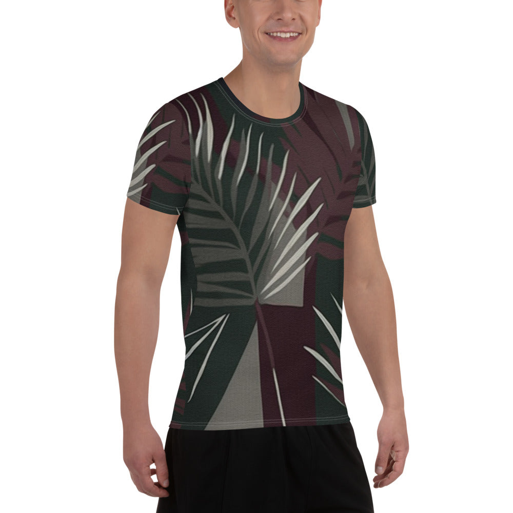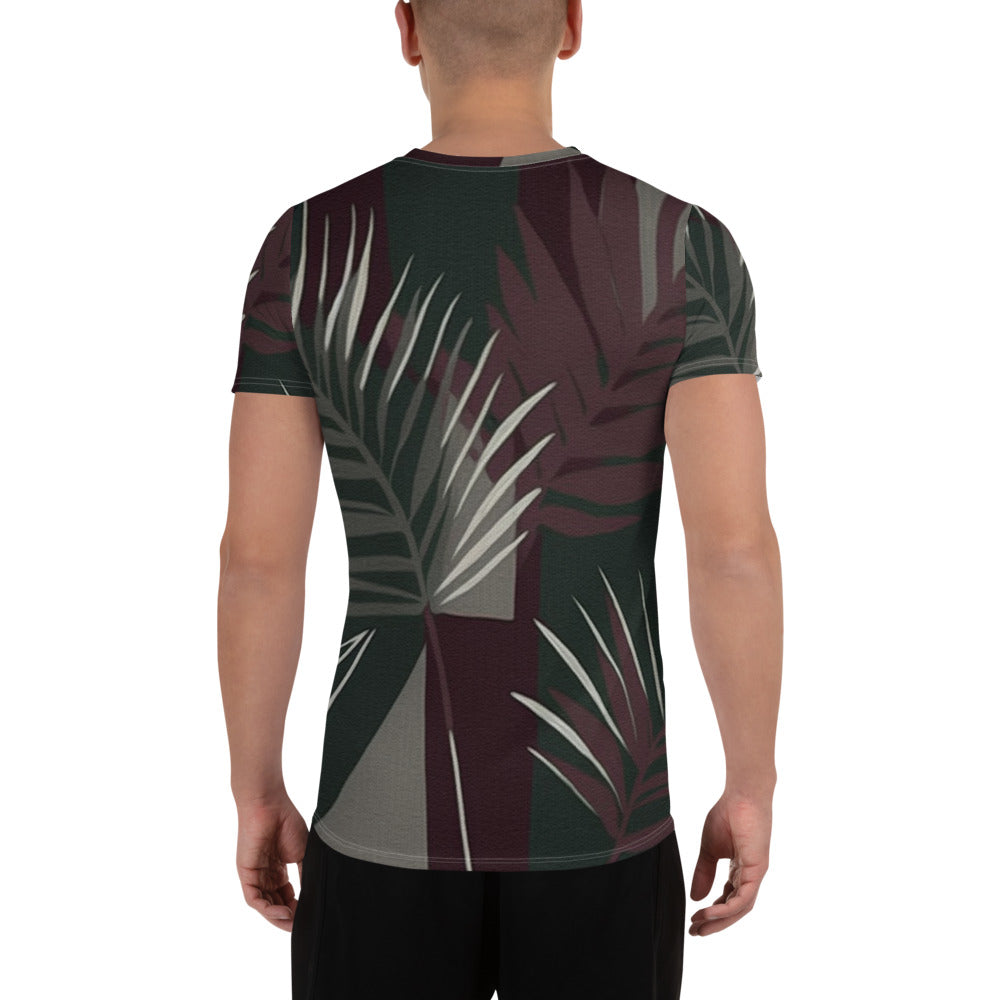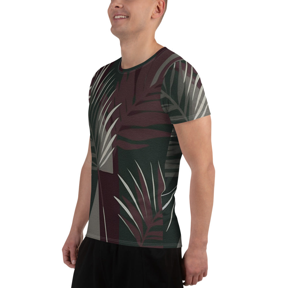 Introducing our Men's Stretch Fit Athletic Sports T-shirt, a perfect blend of style and functionality. This t-shirt features a stunning palm tree leaves design on a maroon green background, making it not only a performance piece but also a fashion statement. Crafted from high-quality materials, this t-shirt is designed to enhance your workout experience while keeping you looking great.