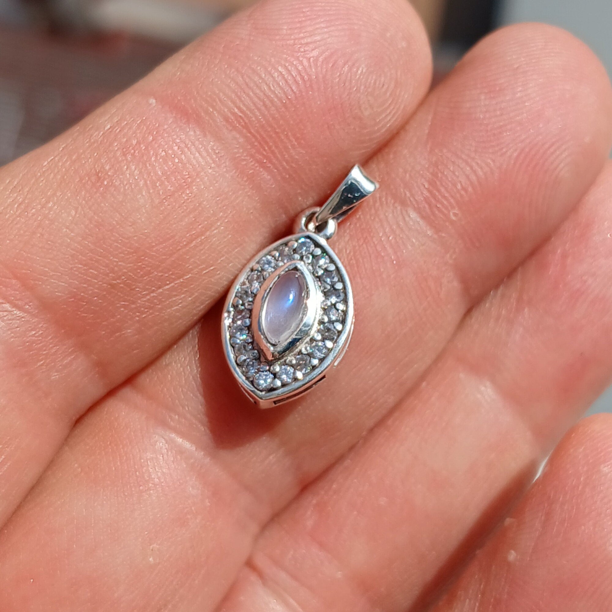 This exquisite Moonstone Pendant is a stunning piece of jewelry that combines elegance and quality. Crafted from high-quality sterling silver, this pendant features a beautiful marquise-shaped Moonstone at its center, surrounded by 18 sparkling cubic zirconias that add a touch of glamour. The pendant is hallmarked with 925, ensuring its authenticity and quality, making it a perfect choice for those who appreciate fine jewelry.
