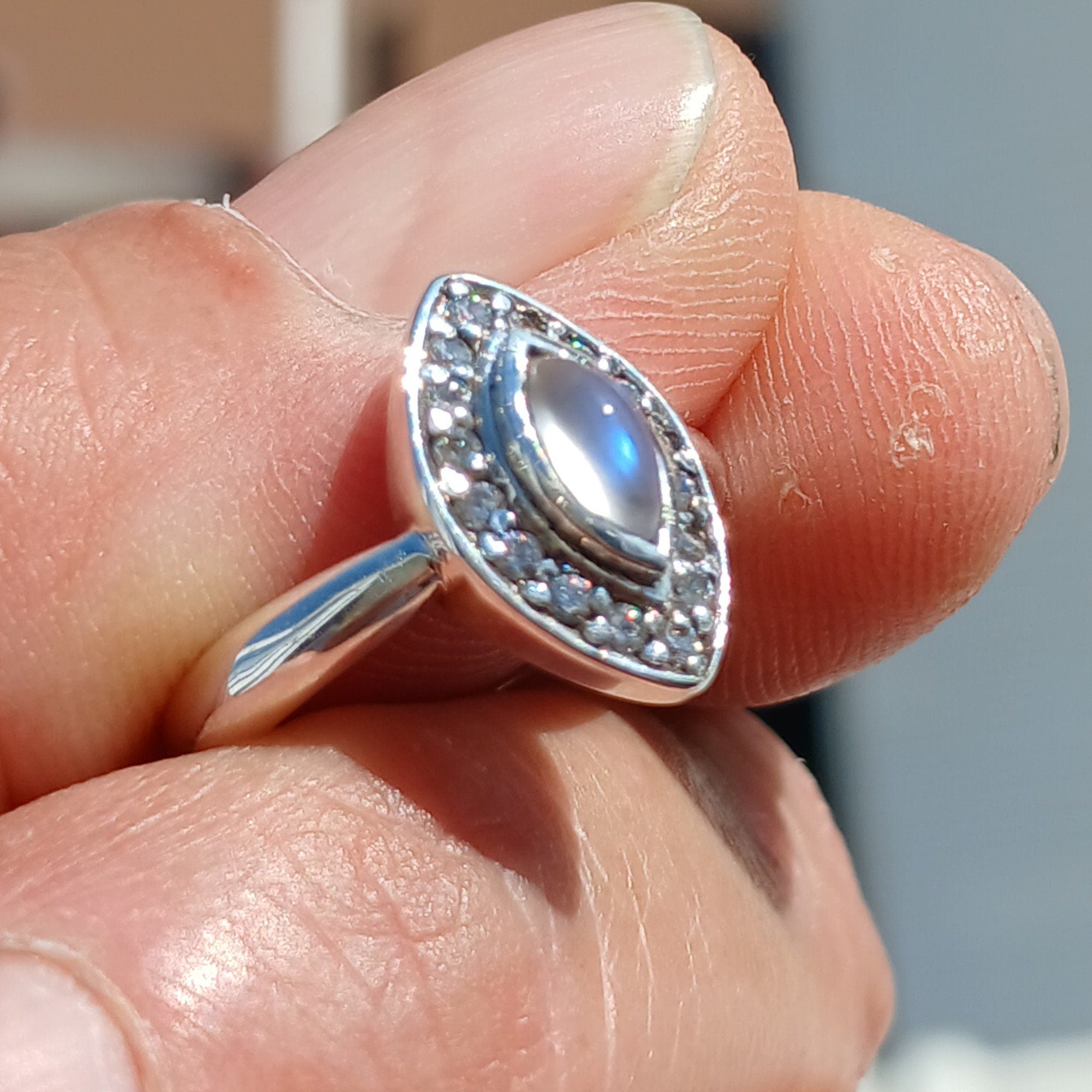 Adding to the ring's allure are the 16 carefully placed cubic zirconia (CZ) stones that surround the Moonstone. These CZ stones are known for their exceptional clarity and brilliance, providing a stunning contrast to the ethereal glow of the Moonstone. The combination of the marquise Moonstone and the sparkling CZ stones creates a harmonious balance that is sure to catch the eye and draw compliments.