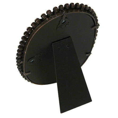 This mirror measures 5 inches wide by 7 inches high, while the frame itself measures 6-1/4 inches wide by 8-3/4 inches high. Its oval shape adds a modern flair to any room, making it a perfect addition to your living space, hallway, or bathroom. The unique design of the frame, made from recycled bicycle chains, ensures that each piece is one-of-a-kind, with its own character and charm.