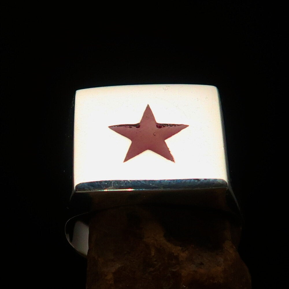 Introducing our exquisite Square Shaped Mirror Polished Sterling Silver Pinky Ring featuring a stunning Red Star design. This ring is not just a piece of jewelry; it is a statement of style and elegance. Crafted from high-quality sterling silver, this ring boasts a mirror-polished finish that reflects light beautifully, making it a perfect accessory for any occasion.
