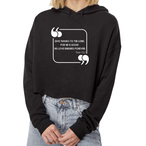 Introducing our Women's Cropped Hoodie, a perfect blend of style and comfort that allows you to express your faith with a fashionable twist. This hoodie features the uplifting phrase 'Give Thanks to the Lord,' making it an ideal choice for those who want to showcase their gratitude while staying trendy. Crafted from a premium cotton/polyester blend, this hoodie is designed to provide you with lasting comfort and durability.