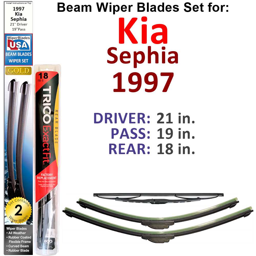 Experience enhanced visibility and safety with our Low-Profile Quality Sealed Flexible Beam Wiper Blades, specifically designed for the 1997 Kia Sephia. This set of three wiper blades includes a driver blade measuring 21 inches, a passenger blade at 19 inches, and a rear blade of 18 inches. With these custom assembled wiper blades, you can ensure a perfect fit for your vehicle, providing you with the best performance in all weather conditions.