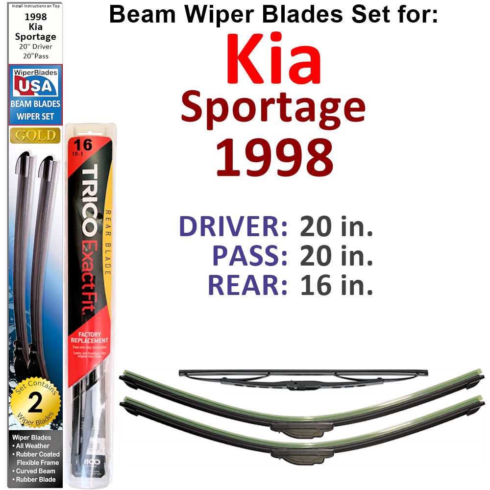 Introducing the Beam Wiper Blades specifically designed for the 1998 Kia Sportage. This set of three wiper blades includes two 20-inch blades for the driver and passenger sides, and a 16-inch blade for the rear. These custom assembled beam windshield wiper blades are engineered to provide a perfect fit and optimal performance, ensuring that your visibility is never compromised, no matter the weather conditions.