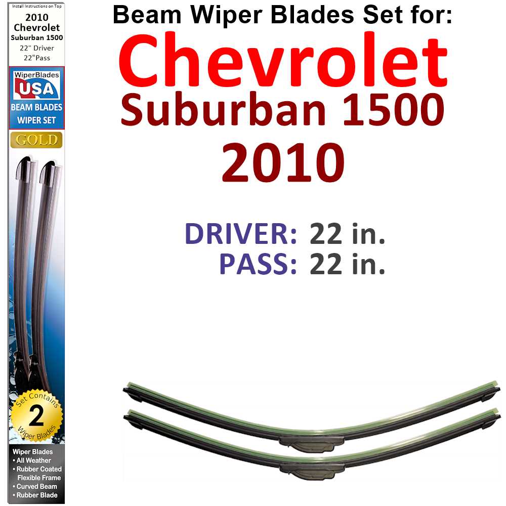 Our WiperBladesUSA Gold Beam Wiper Blades are guaranteed to fit your 2010 Chevrolet Suburban 1500 perfectly when you follow our easy installation instructions. Upgrade your vehicle's wiper system today and enjoy the benefits of superior visibility and performance in all weather conditions.