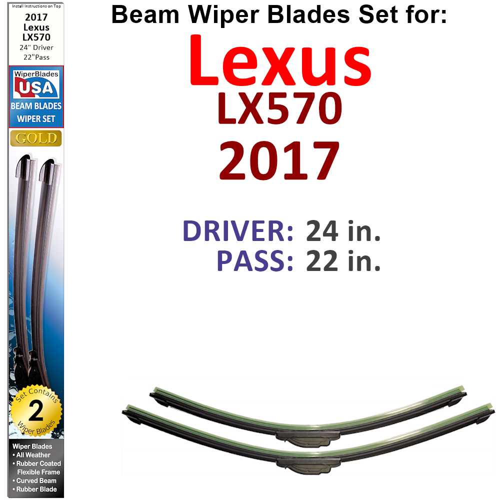 Your 2017 Lexus LX570 requires specific wiper blade sizes: the driver side uses a 24-inch blade, while the passenger side uses a 22-inch blade. Our Beam Wiper Blades are designed to meet these specifications, ensuring a perfect fit and optimal performance.