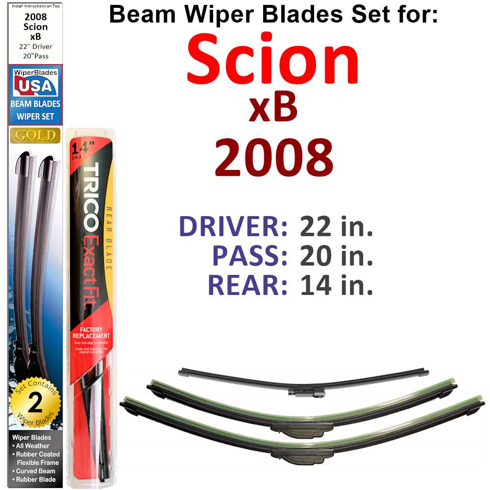 Your 2008 Scion xB requires specific wiper blade sizes: the driver side wiper measures 22 inches, the passenger side is 20 inches, and the rear wiper is 14 inches. Our Beam Wiper Blades are tailored to these dimensions, ensuring a perfect fit and optimal performance.
