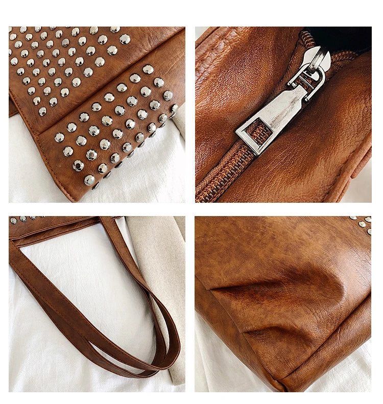 Crafted from high-quality leather, the Rivet Shoulder Bag not only looks luxurious but is also durable and long-lasting. The soft leather material adds a touch of elegance, making it suitable for both casual and formal settings. The zipper closure ensures that your belongings are secure while adding to the bag's sleek appearance.