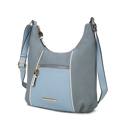 Our Lavinia Shoulder Bag is a slightly slouchy silhouette style you will carry time and again. Crafted from color-block high-quality vegan leather, you will love this style. Designed with gold-tone embellishments, the Lavinia Shoulder Bag unzips to reveal a fully lined interior with slip pockets and a wall zippered pocket. The exterior features one front zip pocket to store your essentials and a convenient back zip pocket. The adjustable strap ensures effortless crossbody or shoulder wear. The bag has our emblem plate on it. The Lavinia Shoulder Bag has a flat base with feet for stability.