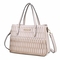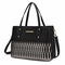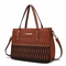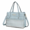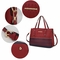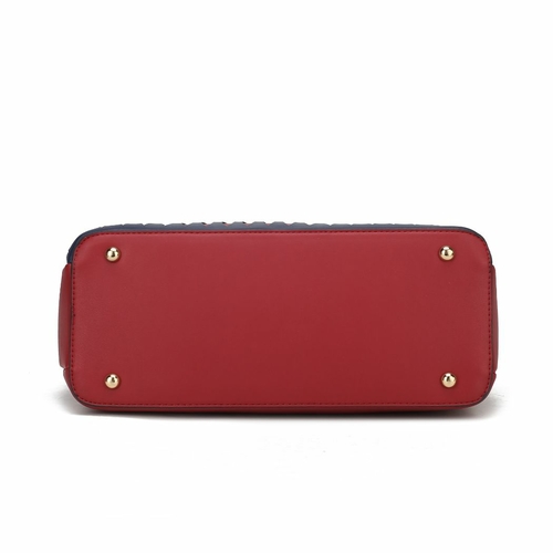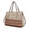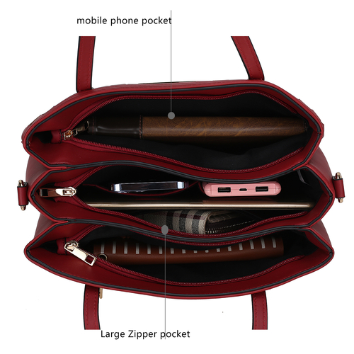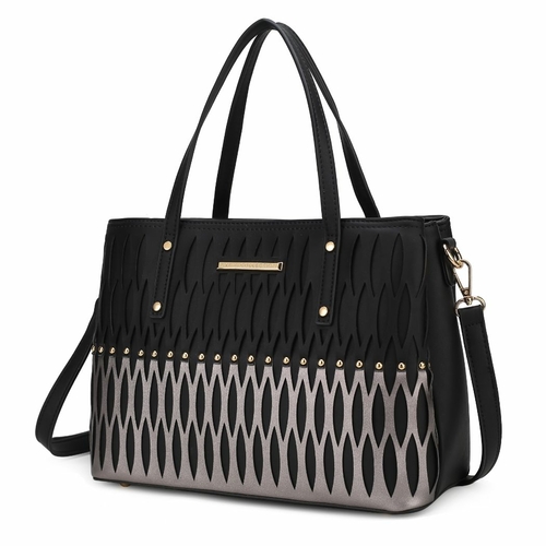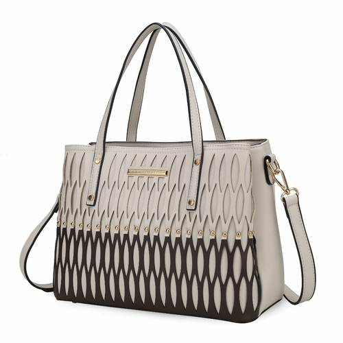 Mesmerizing, the laser cuts take the spotlight in this luxurious Quinn Tote Bag. Accented with gold-tone hardware, this Tote is the perfect statement-making accessory. A color-block finish adds artful allure to the Quinn Tote Bag. Three zippered compartments reveal a fully lined interior with slip pockets and a zippered wall pocket in the center compartment. The exterior features a convenient back zippered pocket. Crafted from smooth vegan leather, this tote has a flat base with feet for stability. It comes with our plate emblem on it. Carry it by the top or attach the adjustable strap to wear it crossbody