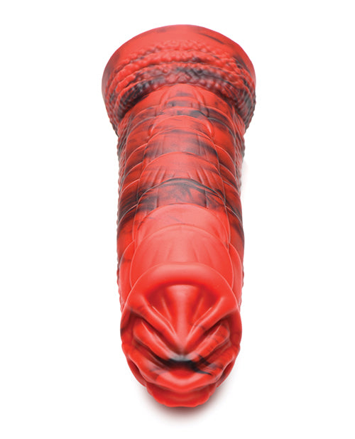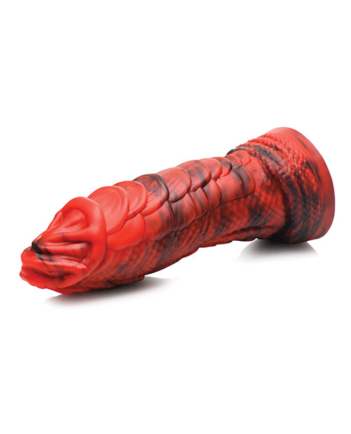 This Fire Dragon's rod is built differently than any you've had before! The rows of dragon-scales, the textured, scaly skin, the ribbed head and the gentle S-curve of the shaft all contribute to the uniqueness of this powerful dragon dong. Take this fiery red and deep black shaft and enjoy handling the heavy, girthy rod made of premium grade silicone. Each touch is silky smooth to balance out all the delicious curves and bumps you'll feel with each penetrating stroke. Completely phthalate-free, it is also body-safe and should be used only with water-based lubricants. Use it manually or enjoy the suction-cup at the base so you can ride hands-free. Bring your kinky cosplay and roleplay fantasies to life with this Fire Dragon Creature Cock! After use, wash with warm water and mild soap, then spray with a toy cleaner and pat dry. Keep separate from other silicone toys.