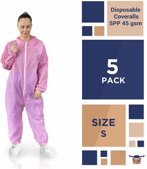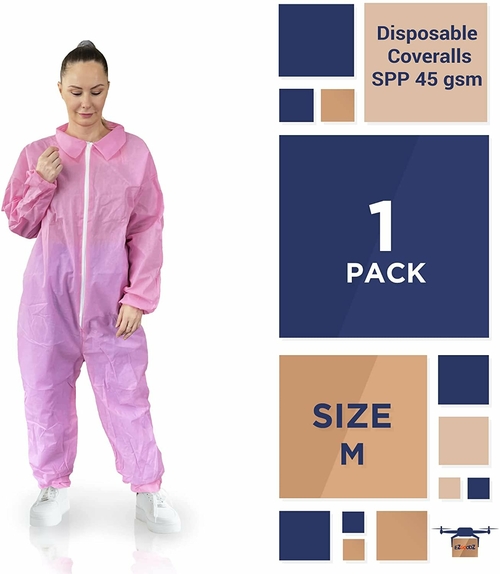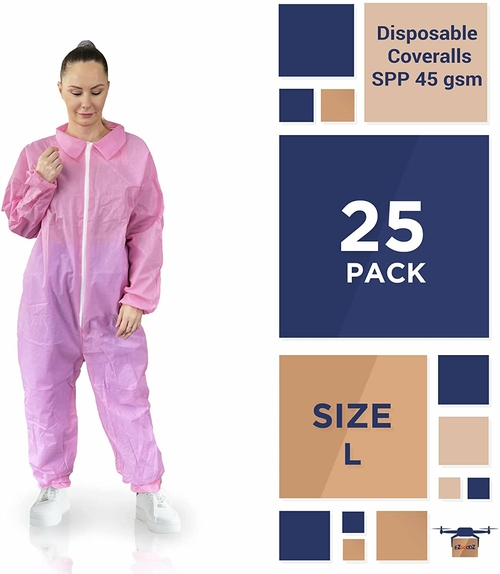 Pink tint garment is constructed from a breathable non-woven spunbond polypropylene 45 gsm fabric. Individually inspected for sizing, stitching and workmanship. Breathable cloth-like fabric is comfortable and cool.