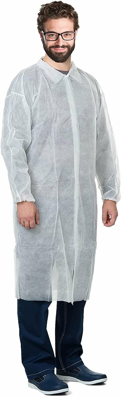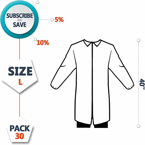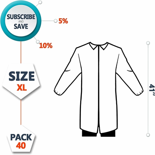 Size: X-LargeLength: 41 inchesQuantity: 40 lab coats per packMaterial: PE + PPDensity: 40 gsmThes