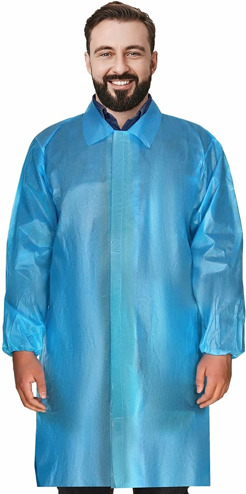Blue Waterproof Polyethylene Coated Polypropylene 40 gsm Laboratory Coats with Velcro Closures, Single Collar, Elastic Wrists in Bulk.