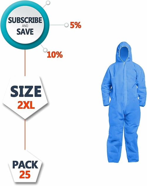 Blue SMS Polypropylene Coverall with Hood, Elastic Wrists Ankles, Zipper, Waist.Color: BlueSize: XXLargeMaterial: SMS (SpunbondMeltblownSpunbond)Weight: 50 gsmQuantity: 25 pieces per packThreelayer SMS roomy design overalls offer an ideal combination of b