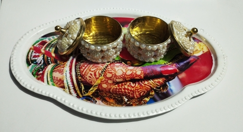 Traditionally Handcrafted Brass 2 Sindoor Dibbi 1 Iron Tray Meena Fancy Work For Women Elegant and decorative piece for wedding and gifting. Good quality product with eye catching impressive design.
