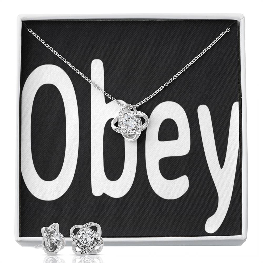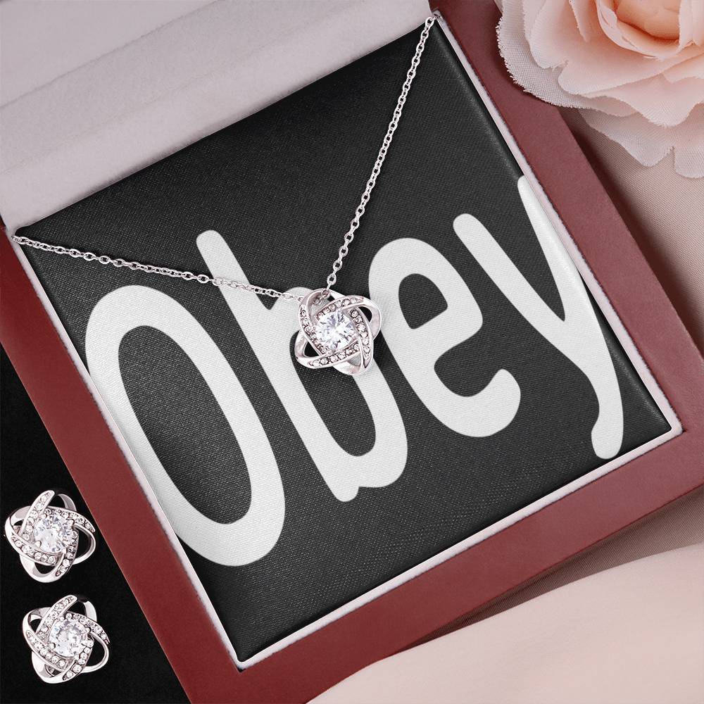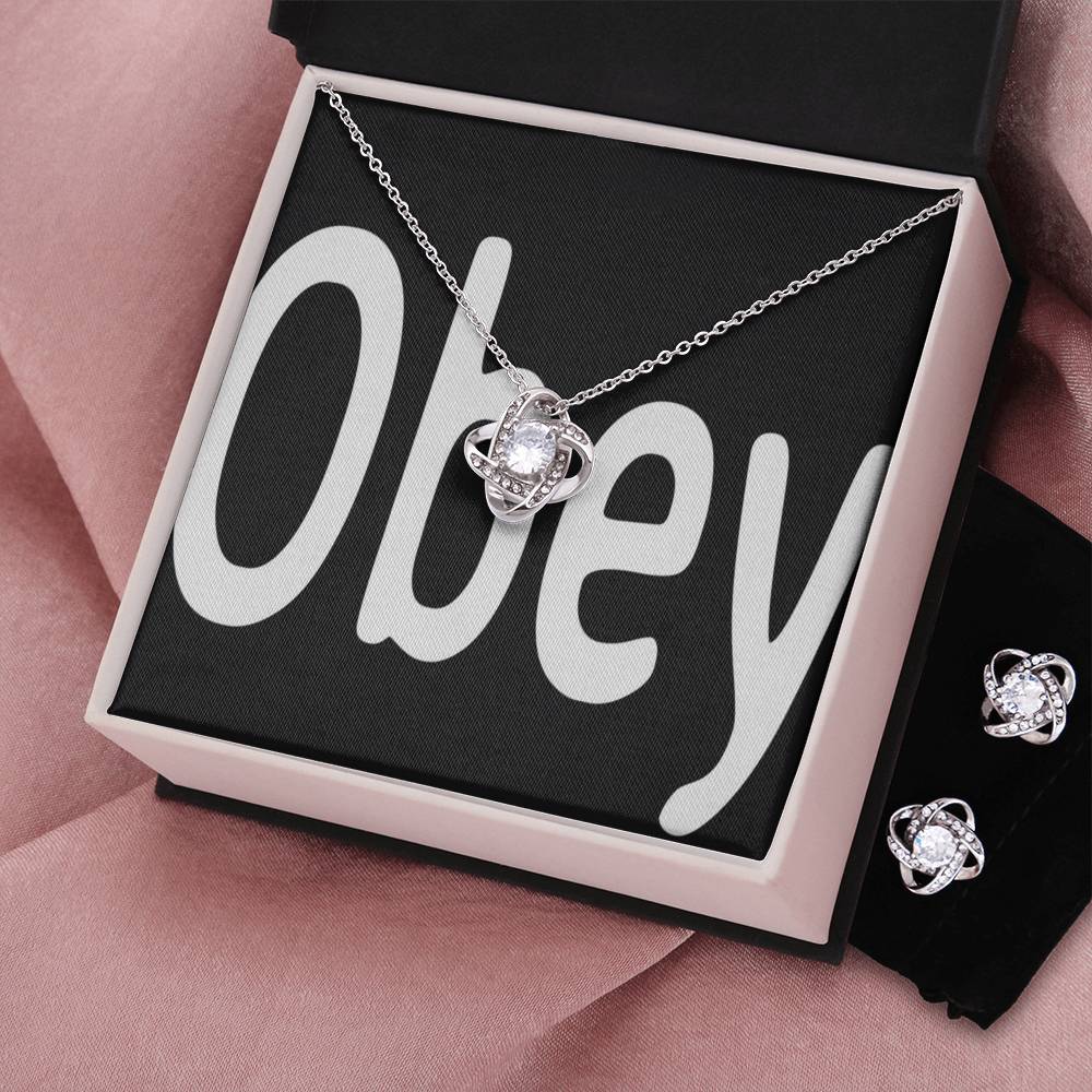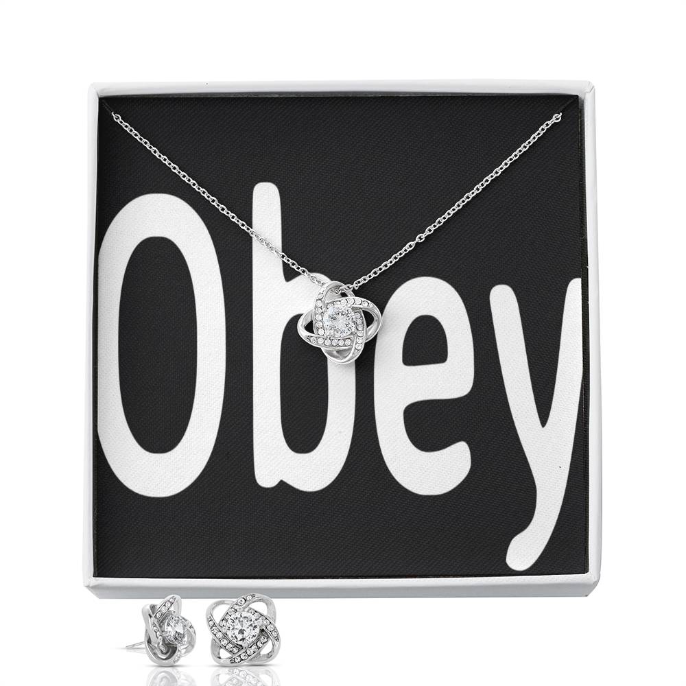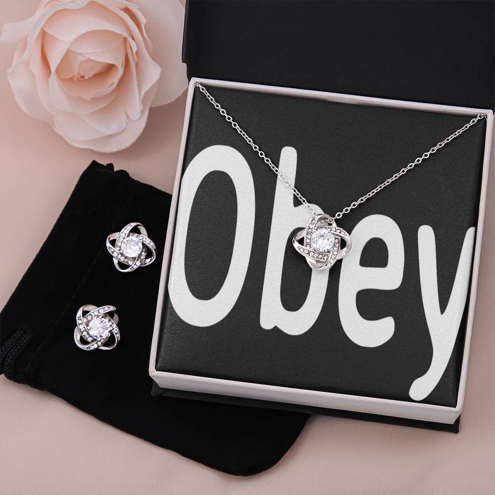 Celebrate your unending love and connection with the Obey Love Knot Earring & Necklace Set. This beautiful jewelry set is perfect for any occasion, whether it's a romantic gesture or a special celebration. Make your loved one's day by gifting this symbol of everlasting love. Purchase it today and let your love shine!