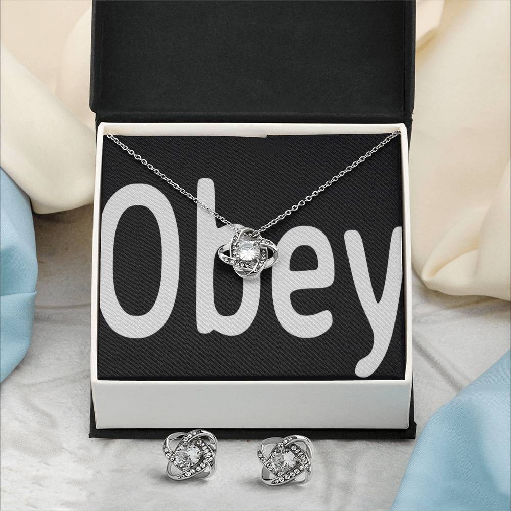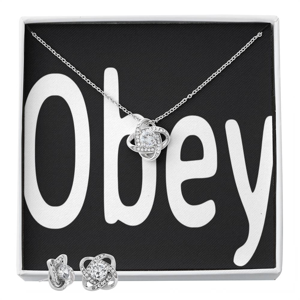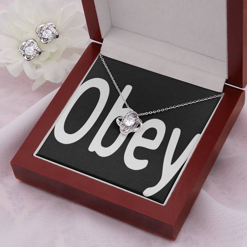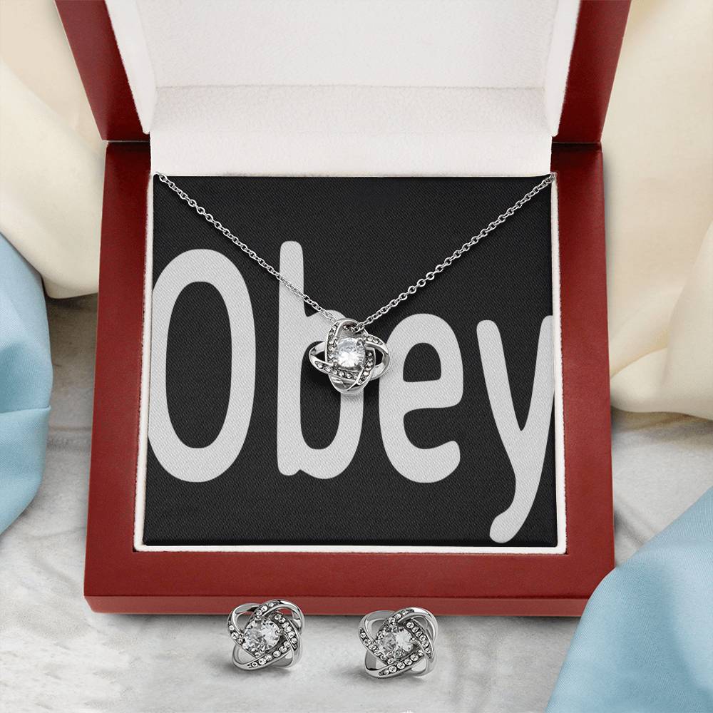 Celebrate your unending love and connection with the Obey Love Knot Earring & Necklace Set. This beautiful jewelry set is perfect for any occasion, whether it's a romantic gesture or a special celebration. Make your loved one's day by gifting this symbol of everlasting love. Purchase it today and let your love shine!