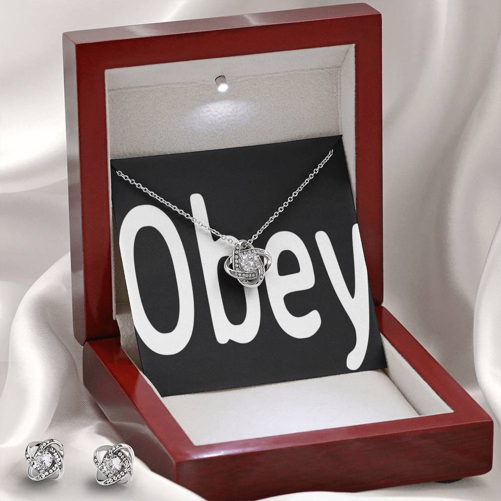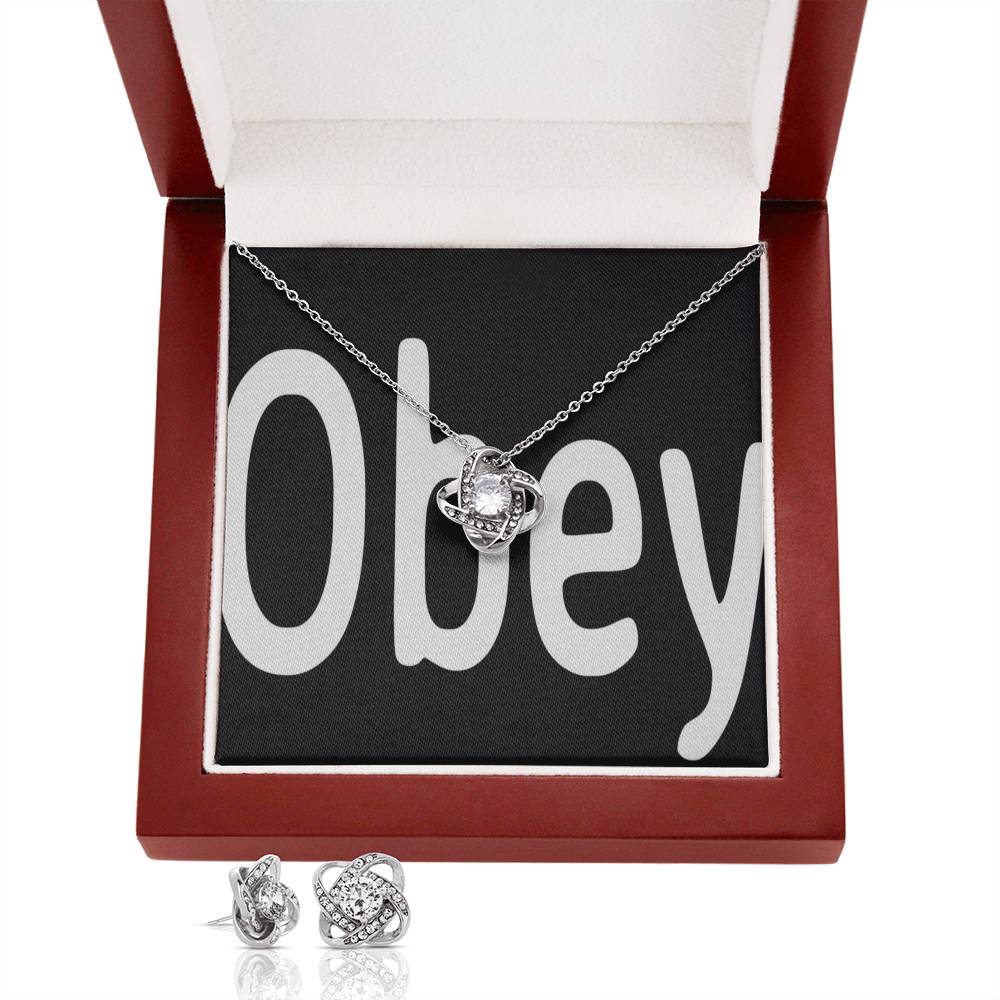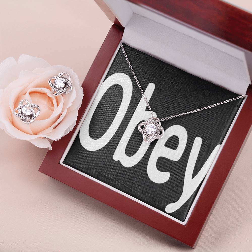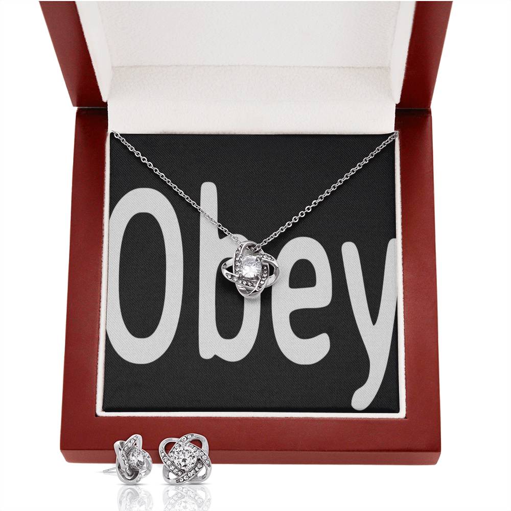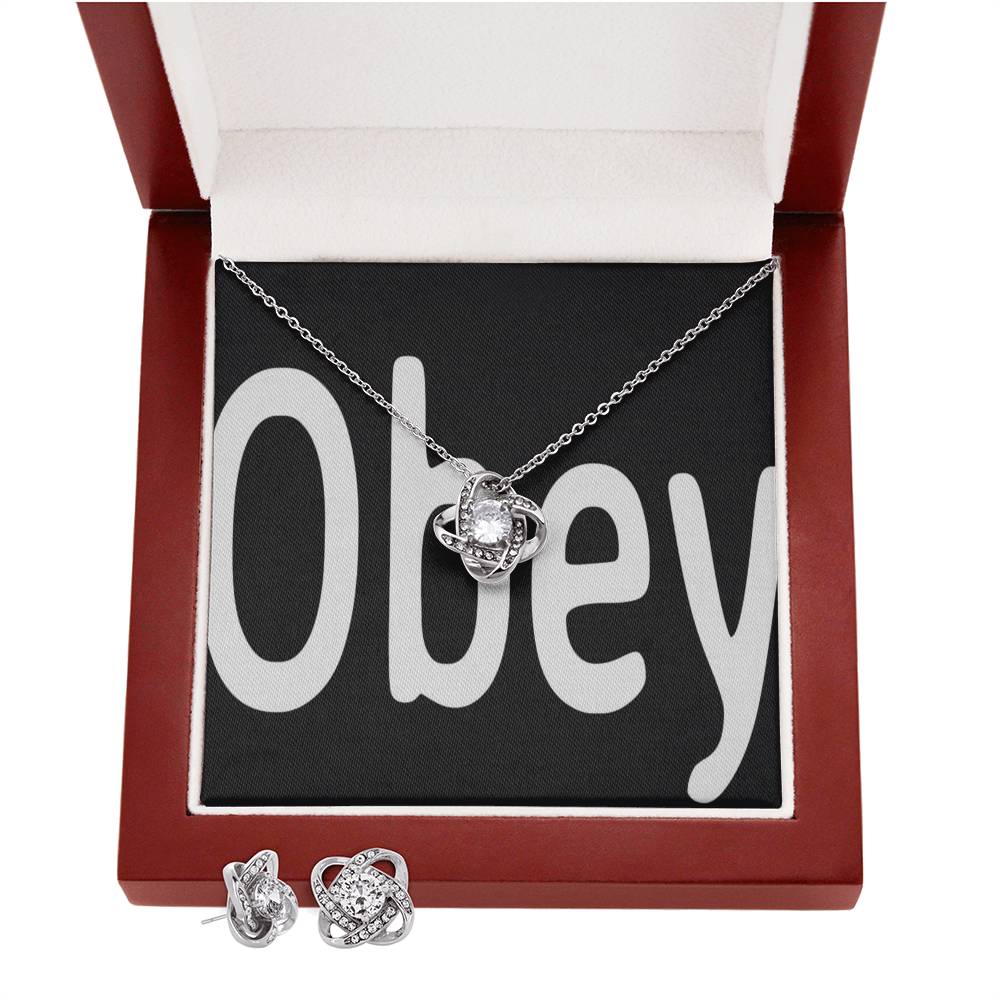 Celebrate your unending love and connection with the Obey Love Knot Earring & Necklace Set. This beautiful jewelry set is perfect for any occasion, whether it's a romantic gesture or a special celebration. Make your loved one's day by gifting this symbol of everlasting love. Purchase it today and let your love shine!