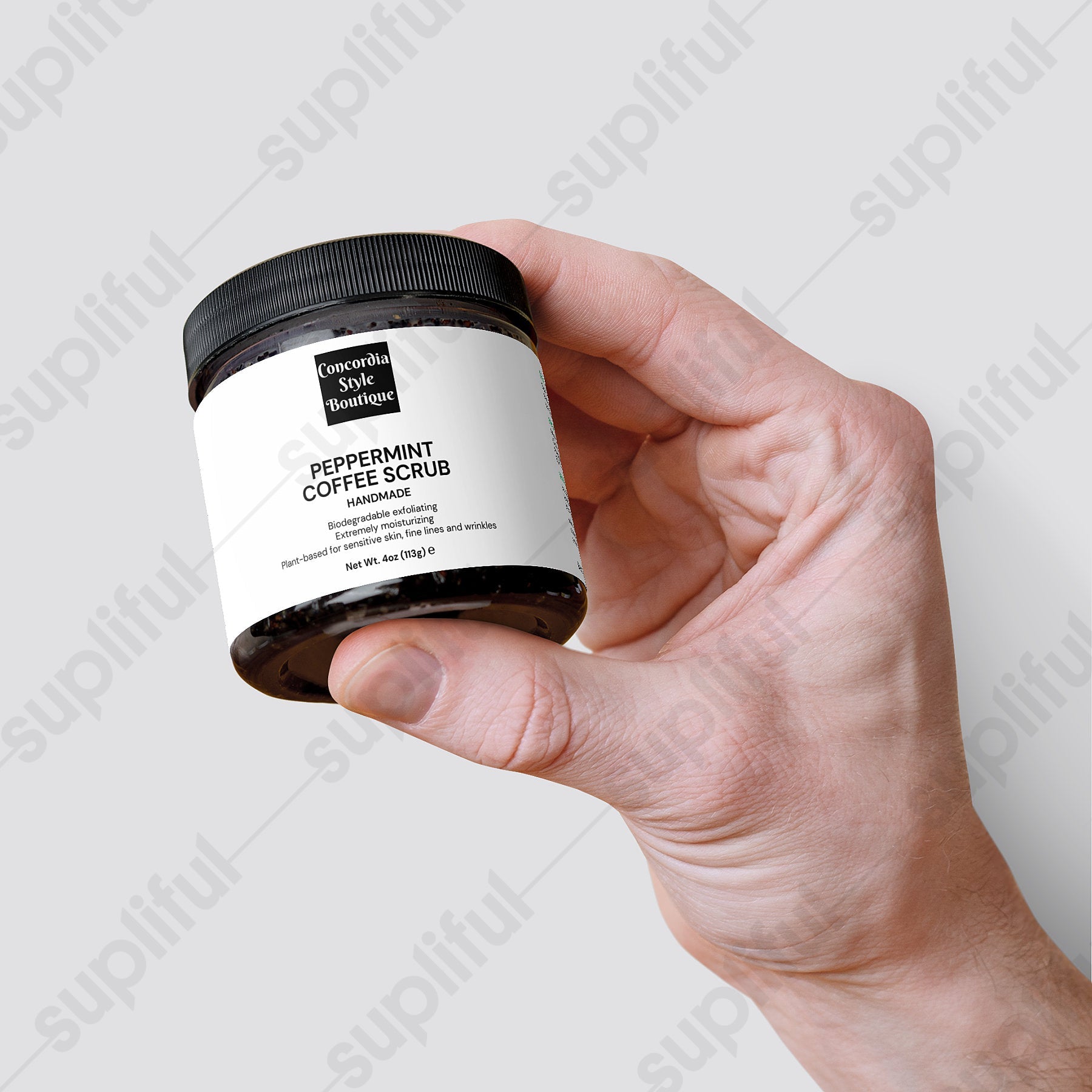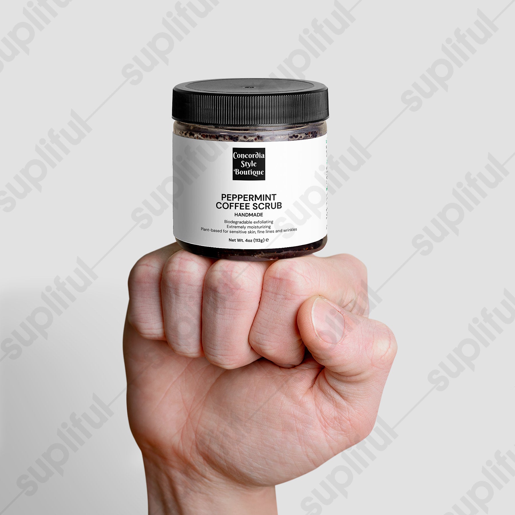 This product is proudly made in the USA, ensuring high standards of quality and safety. Each jar contains 4 oz (113g) of scrub, with a bruto weight of 4.9 oz (255g).