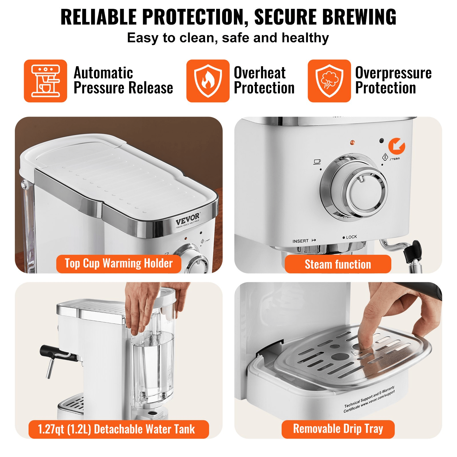 The VEVOR Espresso Coffee Machine is designed with user convenience in mind. It features a removable water tank with a capacity of 1.27qt (1.2L), making it easy to refill and clean. The optimized structure of the machine allows for effortless operation and maintenance, so you can spend more time enjoying your coffee and less time cleaning up.