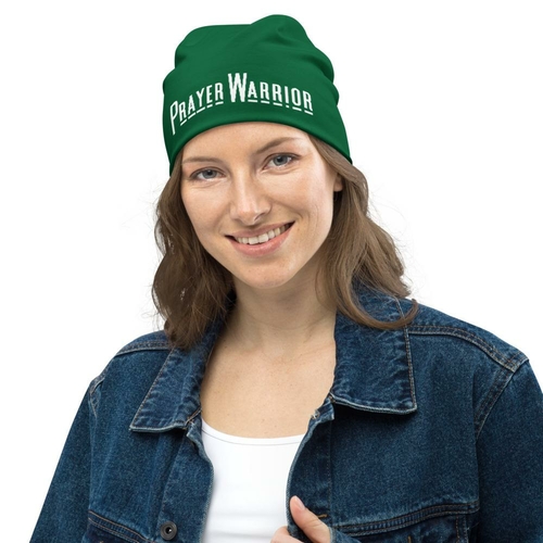 The Dark Green Slouchy Beanie with Prayer Warrior print is the ultimate accessory for those who want to stay warm while making a fashion statement. This stylish beanie hat is designed for both men and women, making it a versatile addition to any wardrobe. Whether you're heading out for a casual day or looking for a cozy accessory to complement your outfit, this beanie is the perfect choice.
