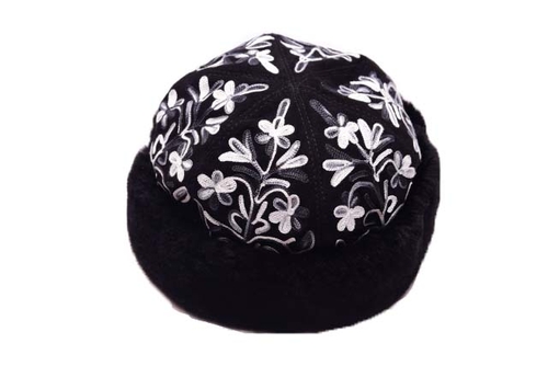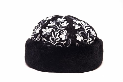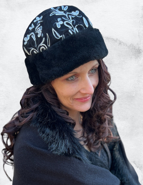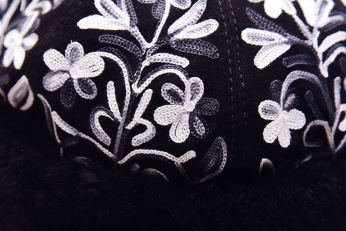 Custom designed stylish suede embroidered hats feature delicate details and a unique look that also promise to keep you cozy. Lamb wool trimming and lining inside.