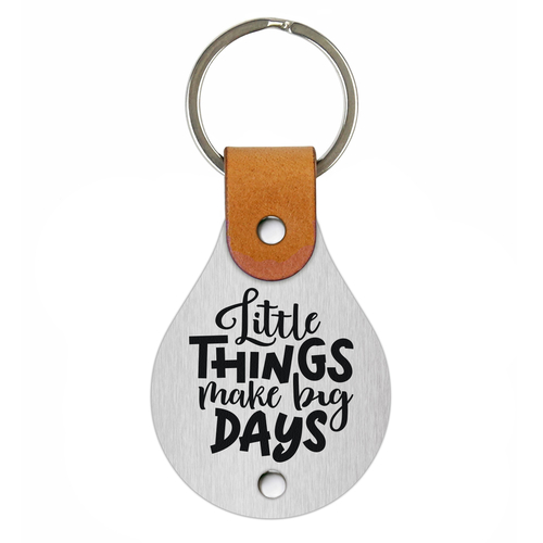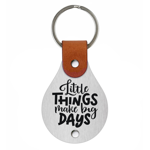 Handcrafted leather keychain with a stainless steel plate, engraved with the picture – Little things make big days.