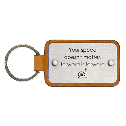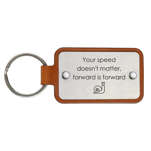 Handcrafted leather keychain with a stainless steel plate, engraved with the picture – Your speed doesn’t matter, forward is forward.