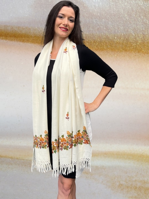 White and Rust Leaves Embroidered Wrap