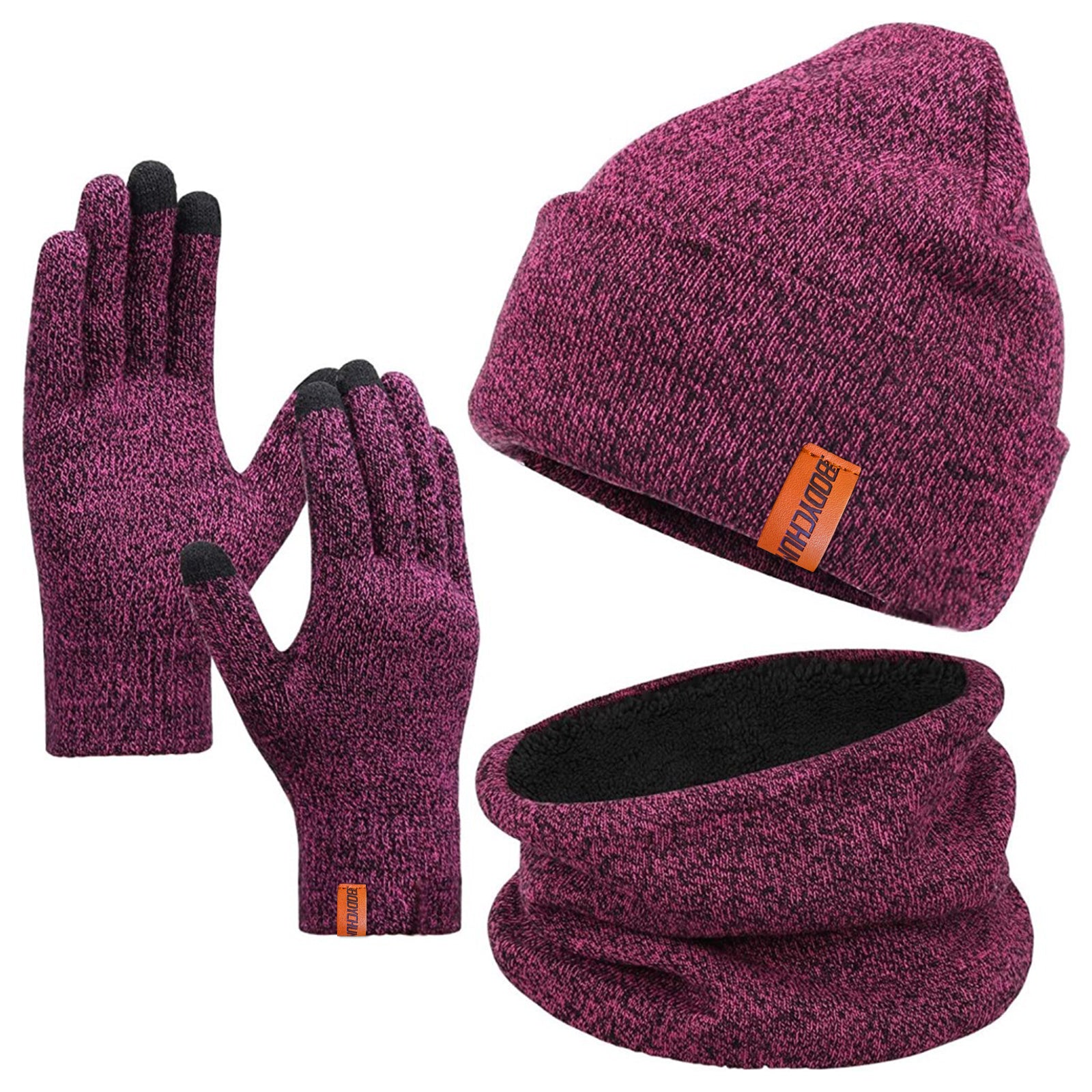 3-in-1 winter knit set including a cozy beanie, long neck scarf, and touchscreen gloves in purple, light gray, and black colors.