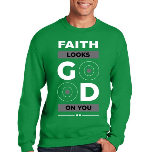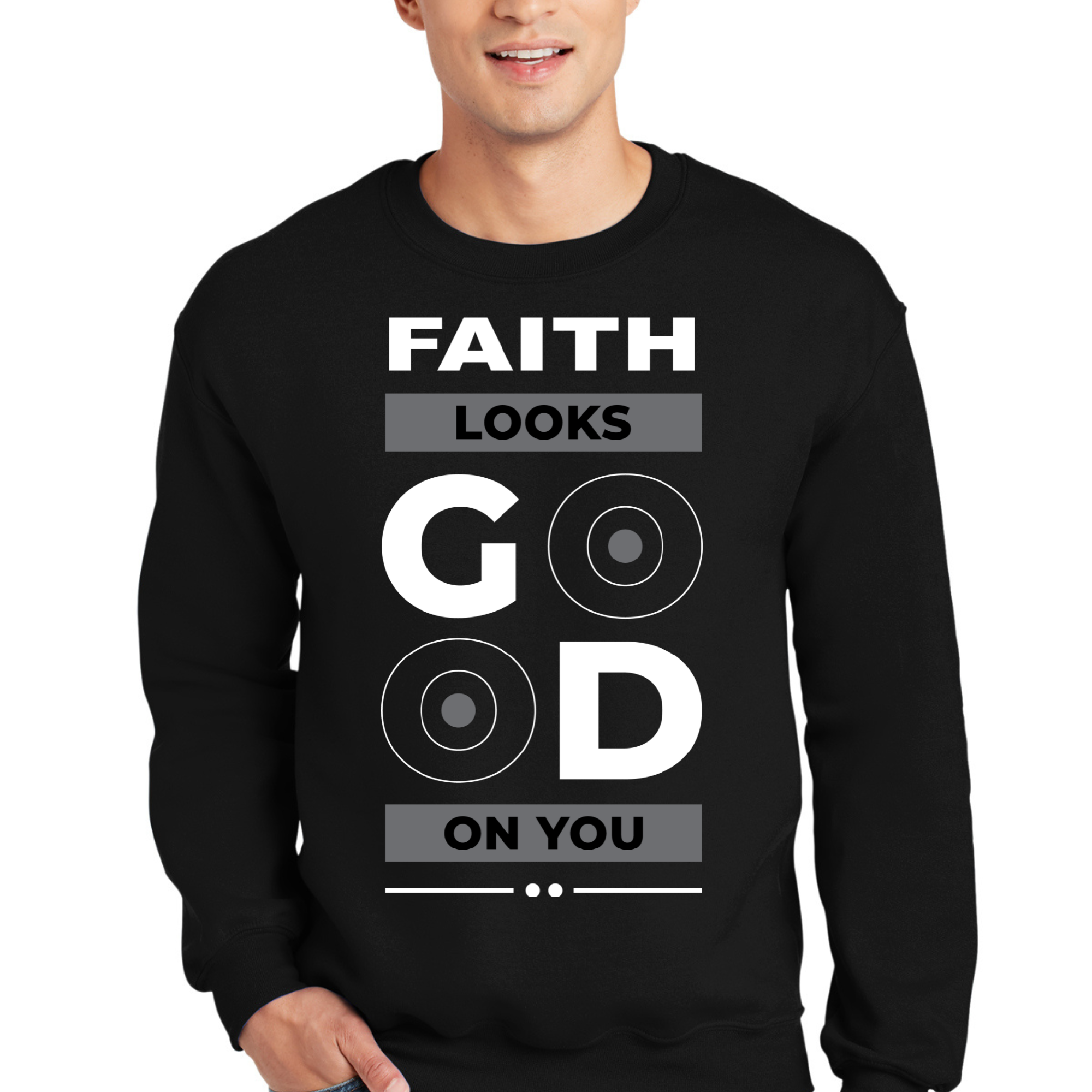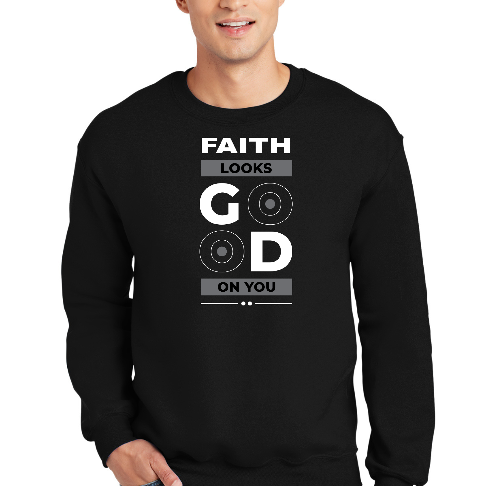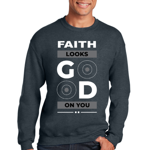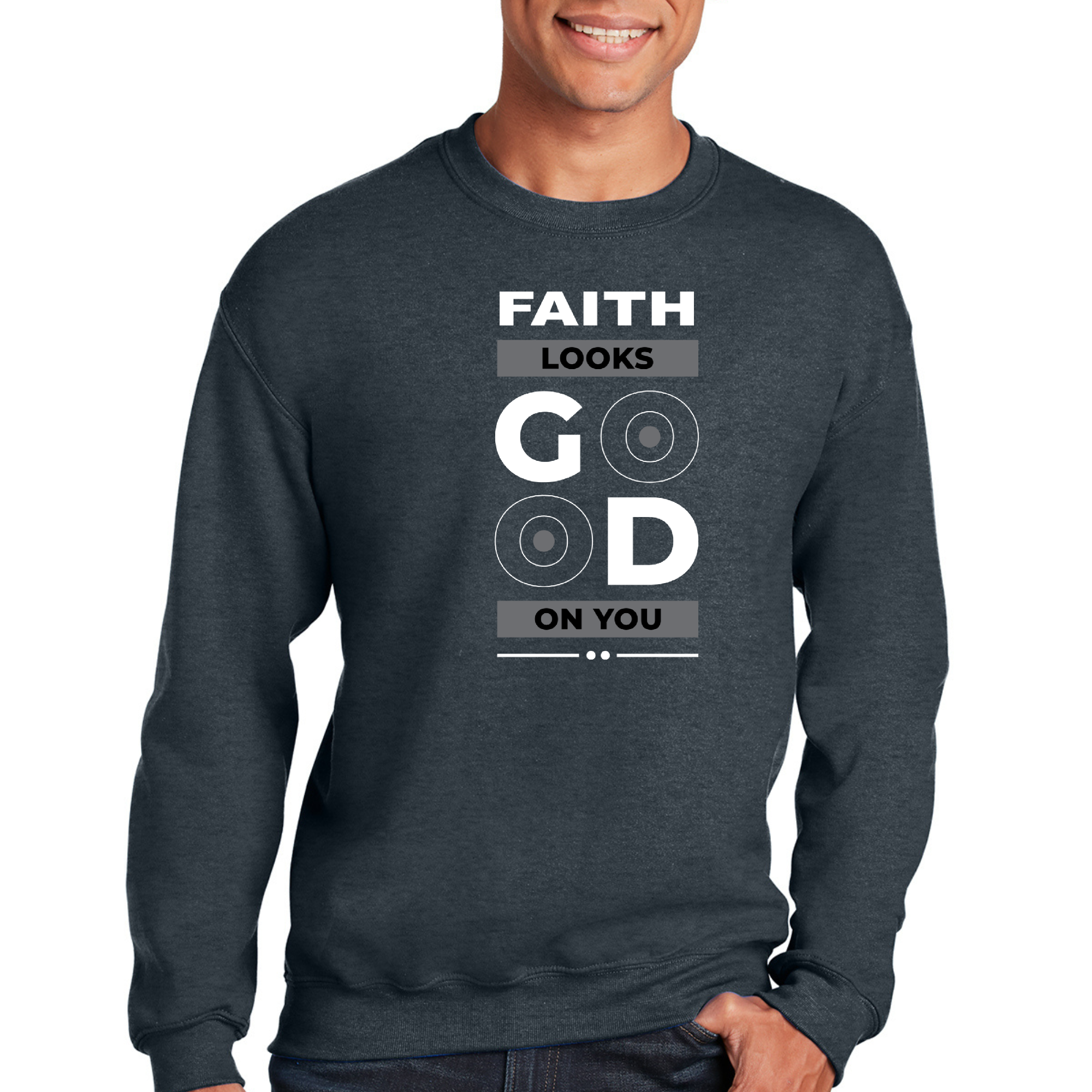 The 'Faith Looks Good On You' graphic adds a unique touch to this classic sweatshirt. It serves as a reminder of positivity and faith, making it a great conversation starter. The design is printed with high-quality inks that resist fading, ensuring that the message remains vibrant wash after wash.