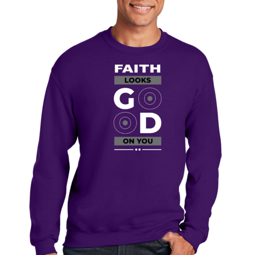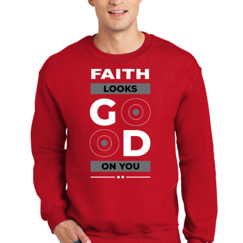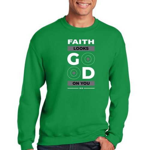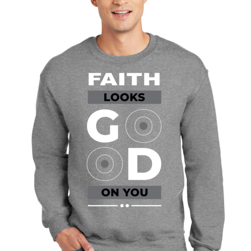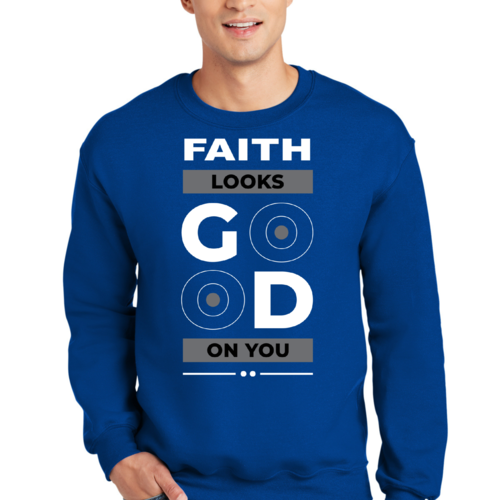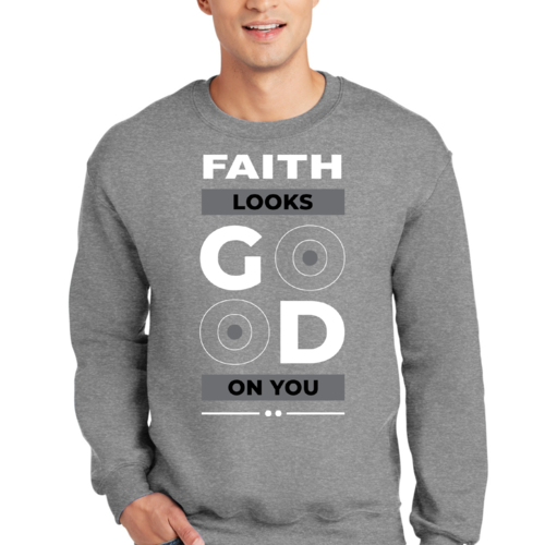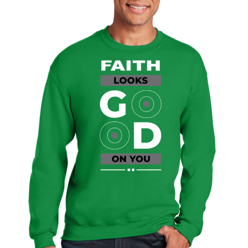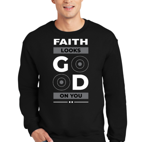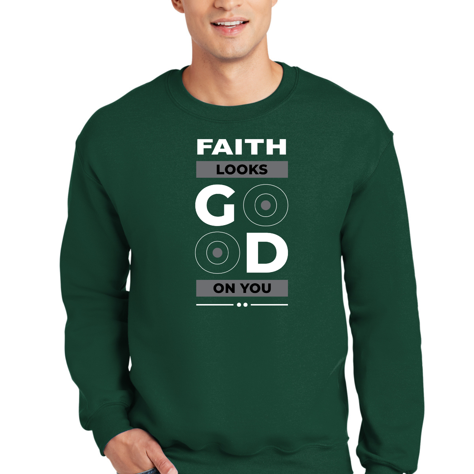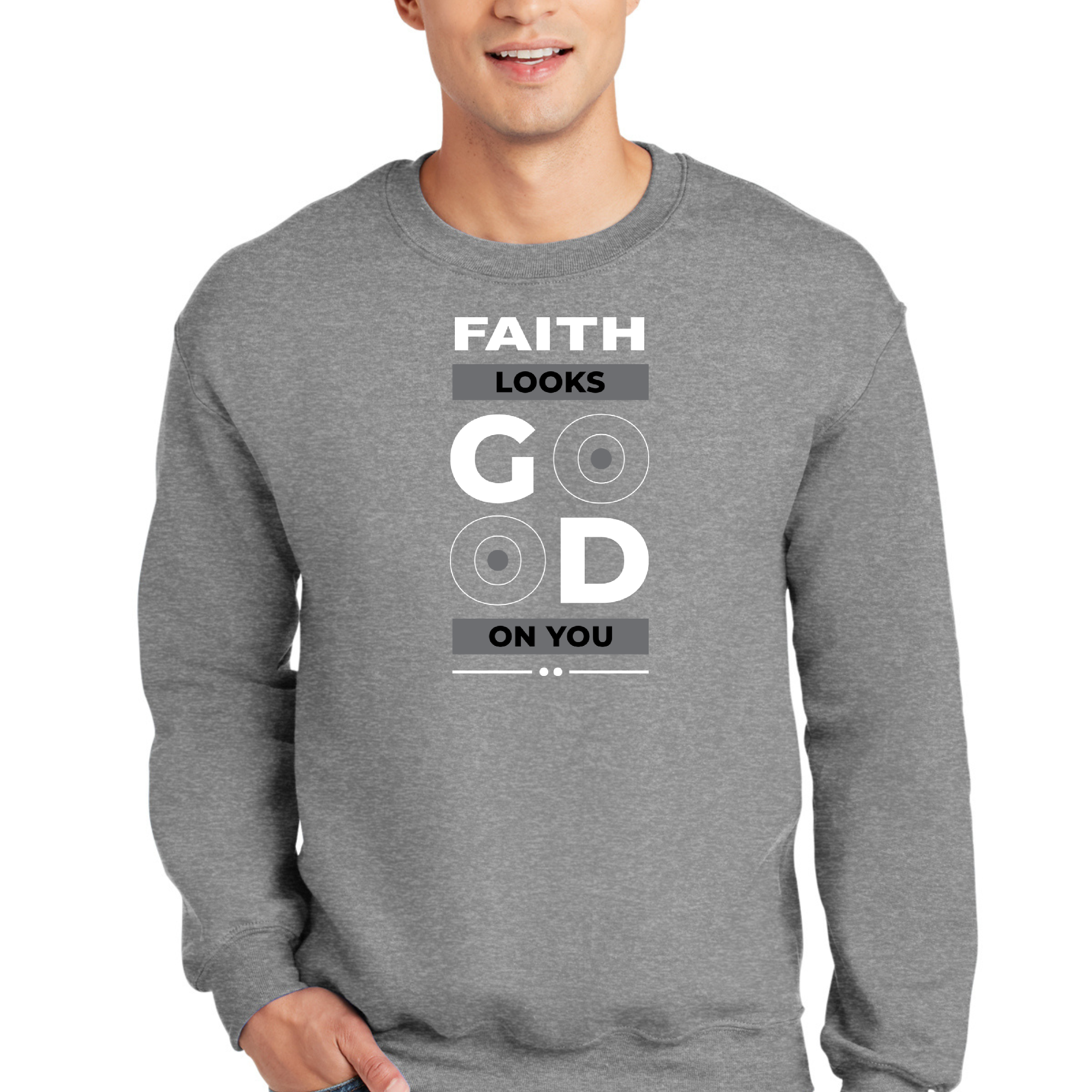 The 'Faith Looks Good On You' graphic adds a unique touch to this classic sweatshirt. It serves as a reminder of positivity and faith, making it a great conversation starter. The design is printed with high-quality inks that resist fading, ensuring that the message remains vibrant wash after wash.