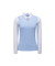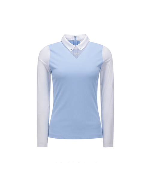 Introducing the ANEW Golf W Triangle Mesh Block Long T-Shirt in S/Blue. This stylish long t-shirt is designed for those who appreciate both comfort and fashion on the golf course or during casual outings. The slim silhouette fits neatly along the body line, providing a flattering look that enhances your figure while allowing for ease of movement.