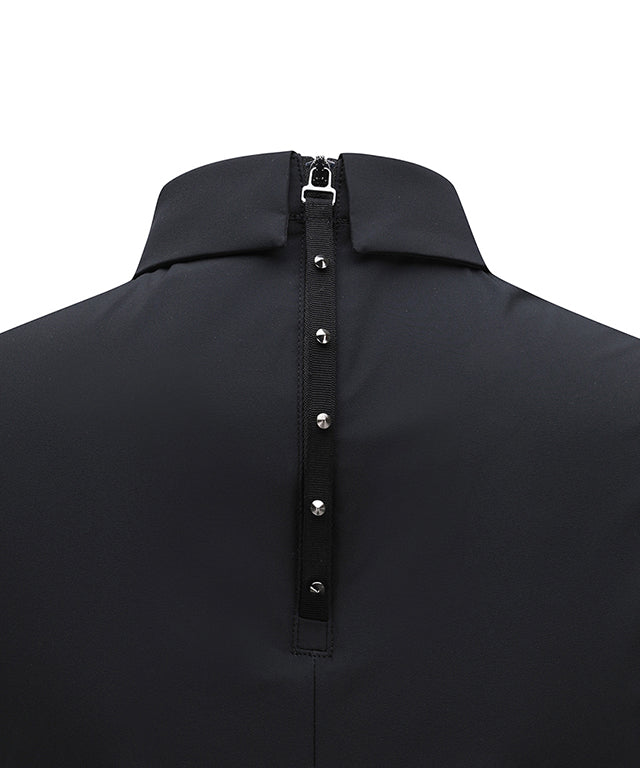 The ANEW Golf one-piece is equipped with a back center zipper that runs from the neck to mid-hip, allowing for easy on and off. Additionally, a long zipper on the left armhole midsection enhances comfort and accessibility. For added convenience, a pocket with a stud on the hip provides storage for small essentials, while a D-ring attached to the waist allows for easy hanging of accessories.