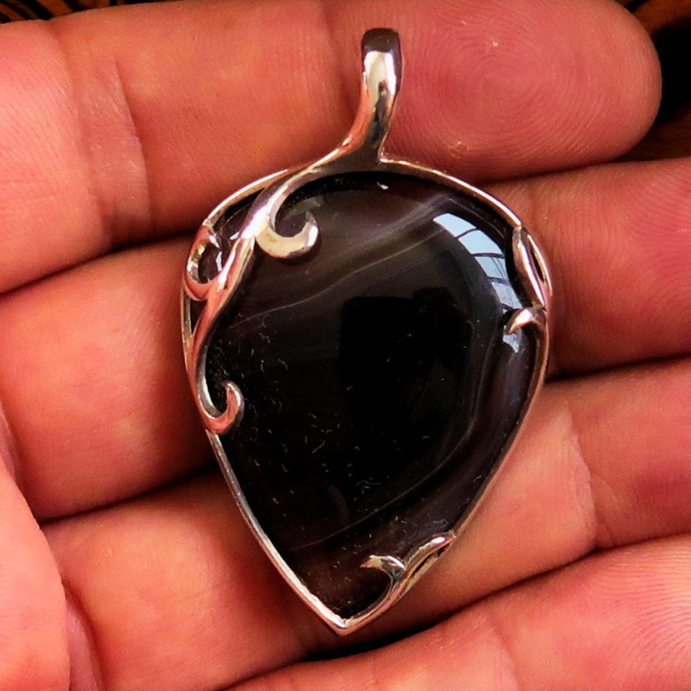Dropship Black Agate Pendant, Sterling Silver Pendant, Floral design, black