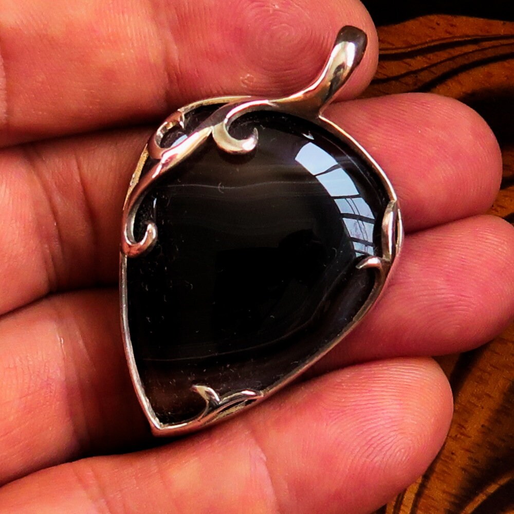 A stunning Black Agate Pendant featuring a floral design in sterling silver, showcasing a black Agate cabochon at its center.